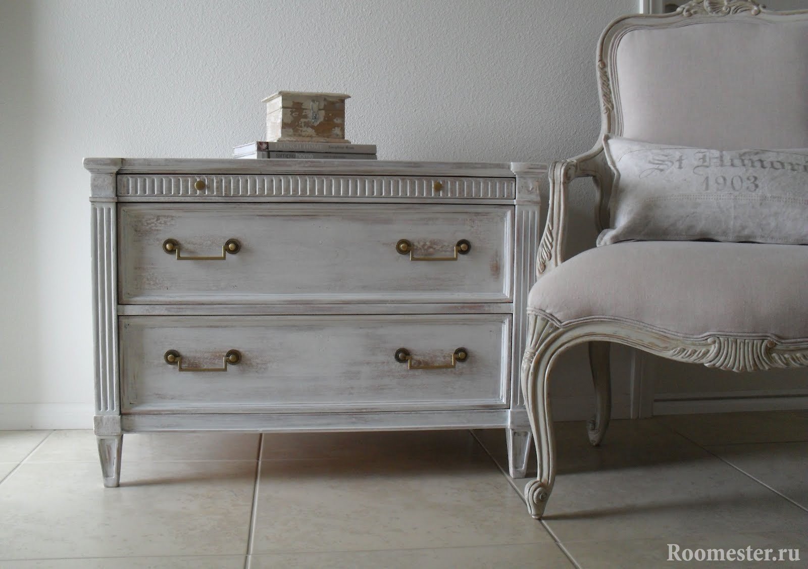 Pero para aquellos que no tenían miedo de trabajar con papel de lija, una espátula y pintura acrílica, se preparó una restauración paso a paso de la cómoda. El proceso consta de varios pasos: eliminar el viejo revestimiento de pintura o barniz, lijar a fondo, verificar si hay virutas y otras irregularidades, rellenar localmente los defectos, pintar y arreglar el cajón.