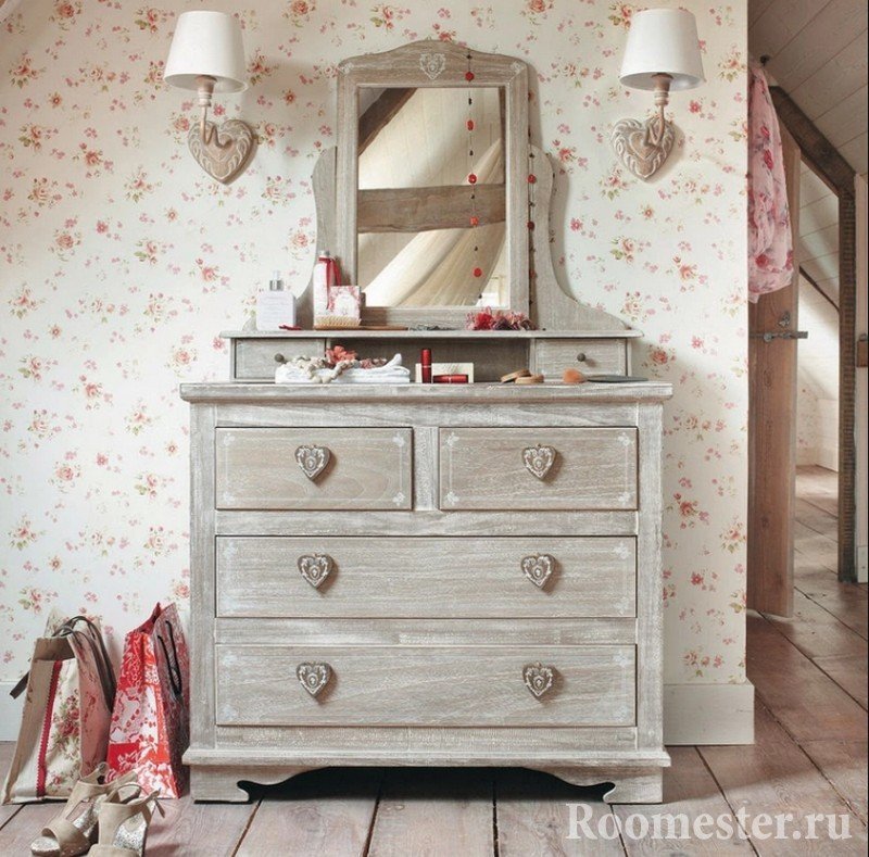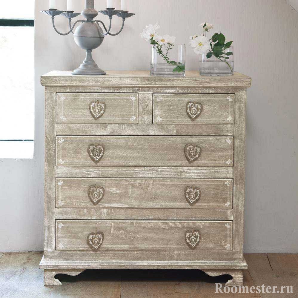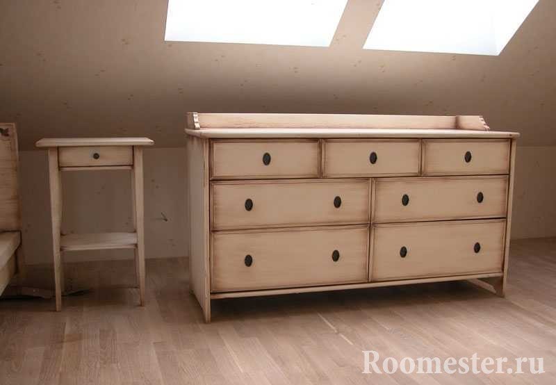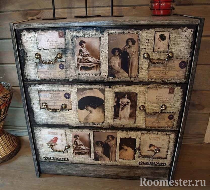 Pero, ¿cómo decorar una cómoda con tus propias manos si está demasiado pasada de moda? Los amantes del campo y la Provenza apreciarán la decoración antigua. Este diseño ahora es popular, y para el trabajo necesitará lo siguiente: