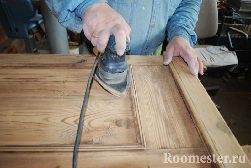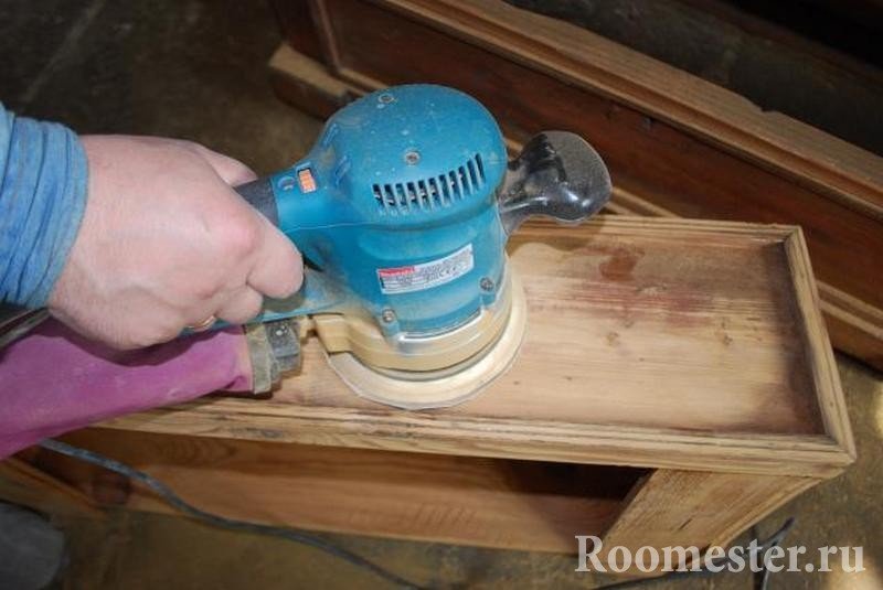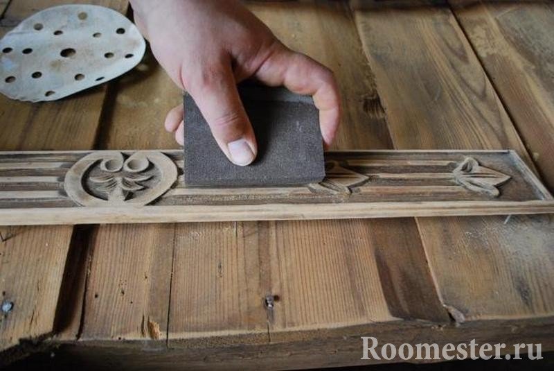 Una superficie libre de pequeños elementos decorativos se lija con una máquina. Para este último, es importante elegir la boquilla correcta. Con papel de lija o con una esponja de lijado, trate el área de las partes sobresalientes y las piezas pequeñas. No exagere al lijar, para no dañar la cómoda.