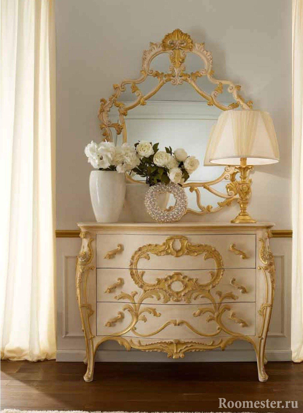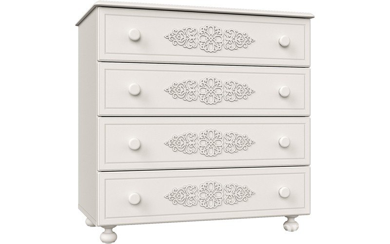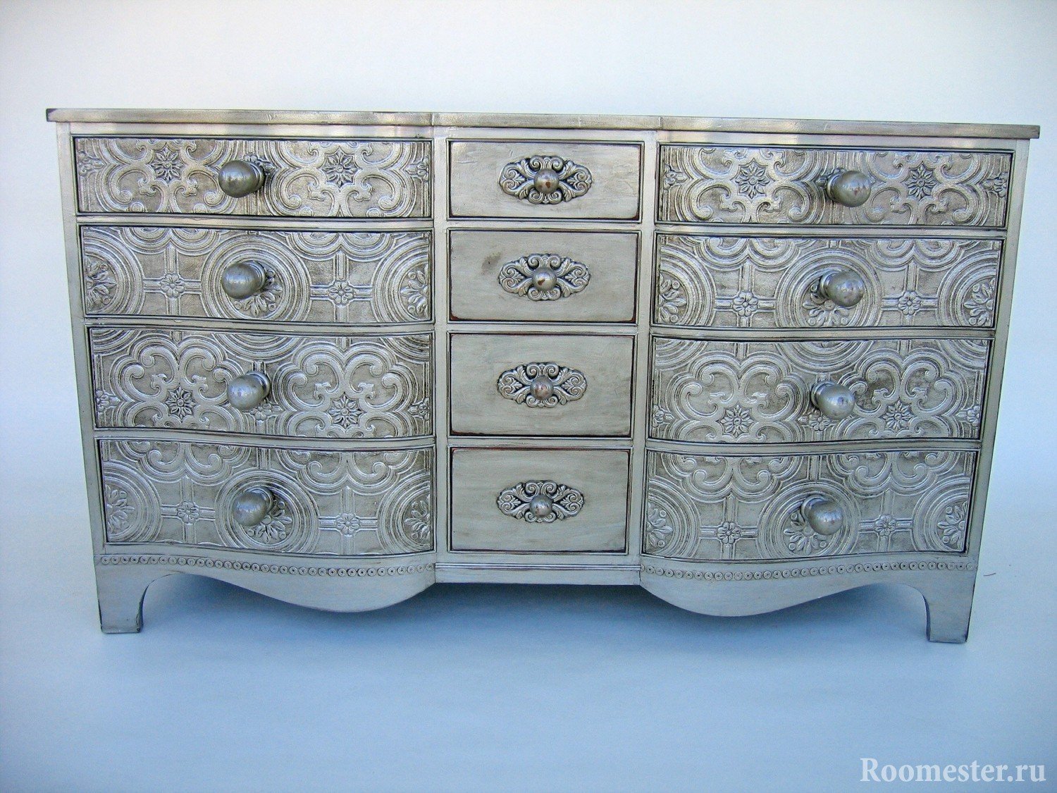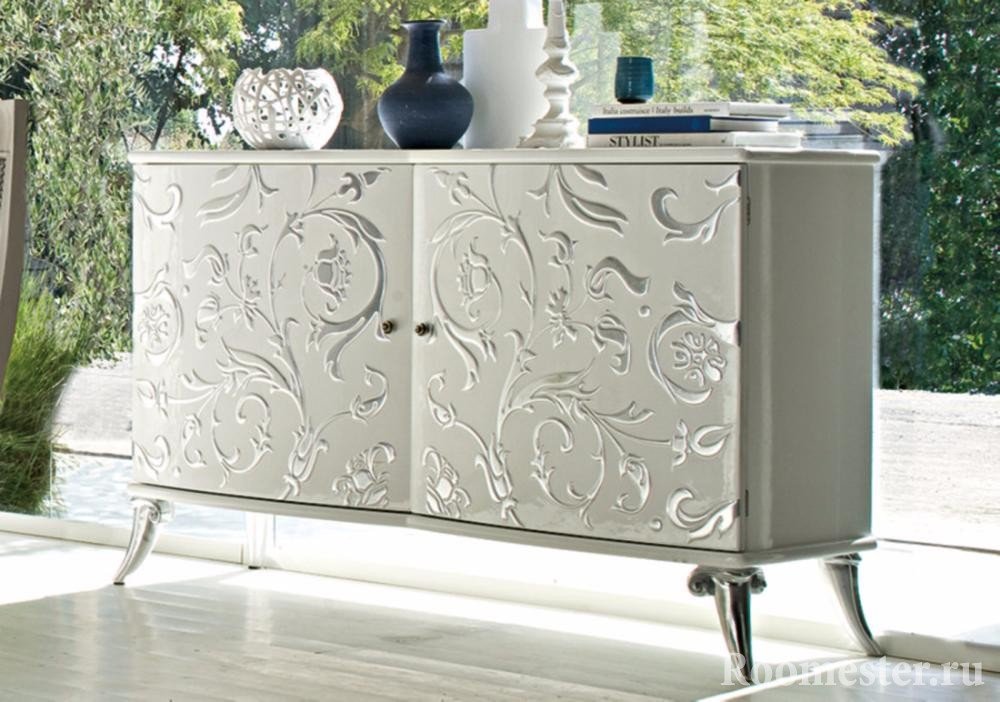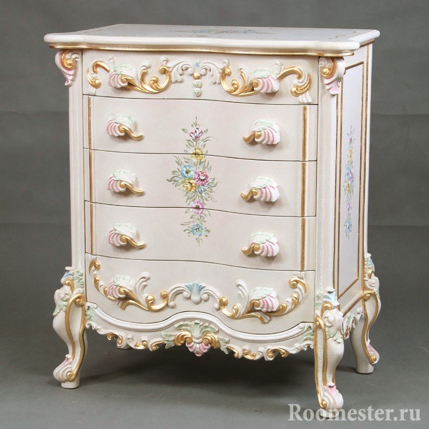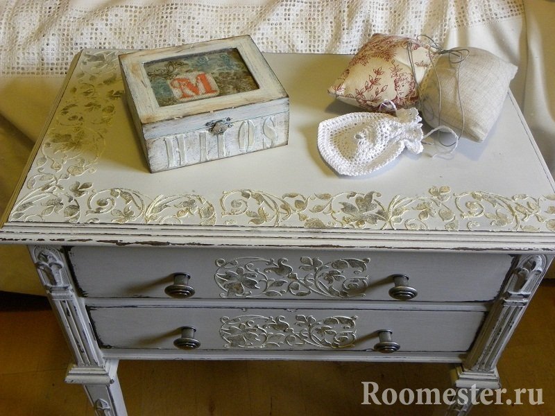 La decoración de la cómoda en este estilo comienza con la eliminación de los accesorios y la extracción de todos los cajones. Las plantillas están montadas en la superficie y cubiertas con masilla. Recorte con una espátula y deje secar el patrón volumétrico. Puede hacer que los muebles sean monofónicos o resaltar elementos creados. Si se trata de una selección, simplemente frote las partes convexas con cera por analogía con el método anterior y, después de cubrirlas con pintura, bórrelas en las áreas de cera. Esta es una buena manera de restaurar una antigua o darle un encanto especial a una nueva cómoda.