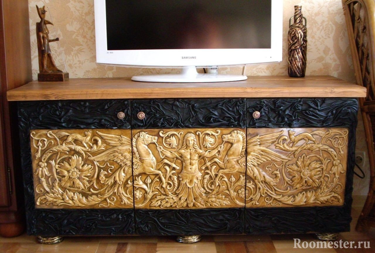 Decoración para armarios de TV con sus propias manos, aparador, armario o cómoda. Esta técnica es aplicable a cualquier mueble y no requiere grandes gastos. Se necesitan plantillas que se corten fácilmente de cartón. Todavía necesita cinta de enmascarar, esponjas, pinceles, espátula, pinturas acrílicas (se usan con mayor frecuencia blanco y marrón), pasta a granel o masilla a base de acrílico.