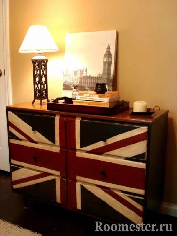 Pero el diseño de una cómoda con sus propias manos no se limita a la idea de decoupage. Un producto antiguo es ideal para el estilo inglés, incluso si tiene defectos notables. Necesitará cuatro colores: blanco, rojo, azul y marrón. Los tres primeros son pintura acrílica, el último es aceite. De los materiales también son útiles masilla, espátula, topazlaz, cinta de enmascarar, papel de lija, clavos decorativos, brochas y rodillos.