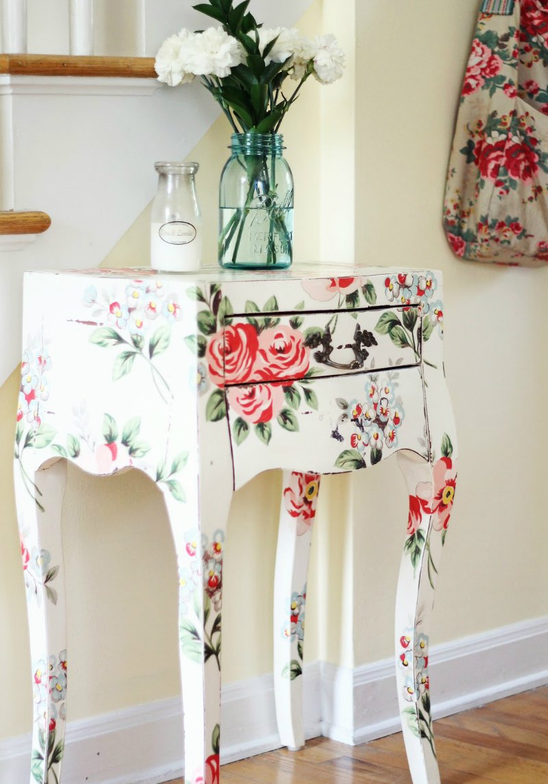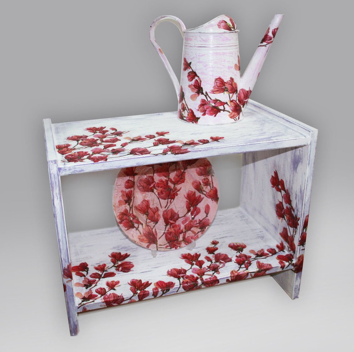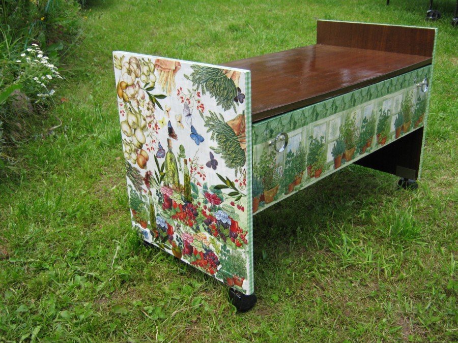 Una nueva dirección interesante es el decoupage de muebles con un paño. Al trabajar, puede usar cualquier combinación, combinar diferentes temas y colores. Se requerirá todo tipo de jirones, pegamento, barniz, esponja y cepillos.