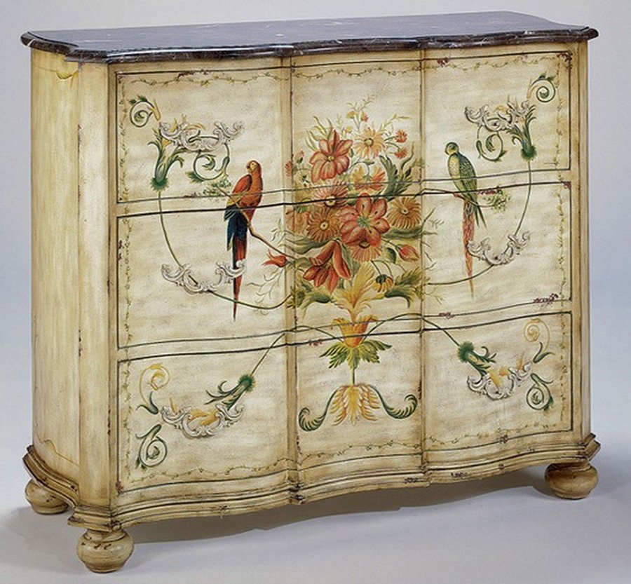 Primero que nada, la vieja cómoda necesita ser pintada. Puede ser acrílico o a base de tiza de colores. Los artesanos experimentados recomiendan usar la segunda opción, porque, en su opinión, es más uniforme. Puedes trabajar con una brocha o rodillo ancho.