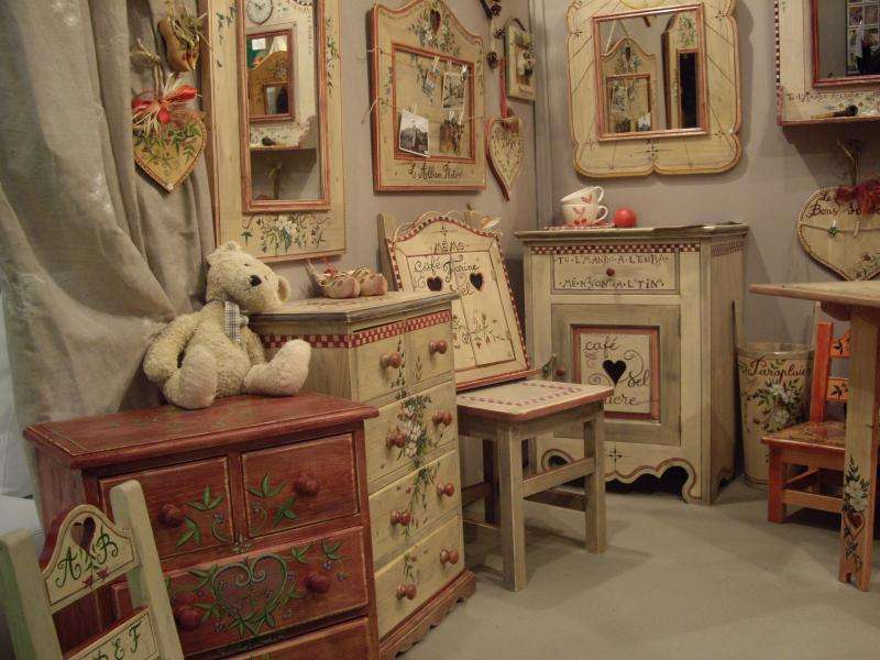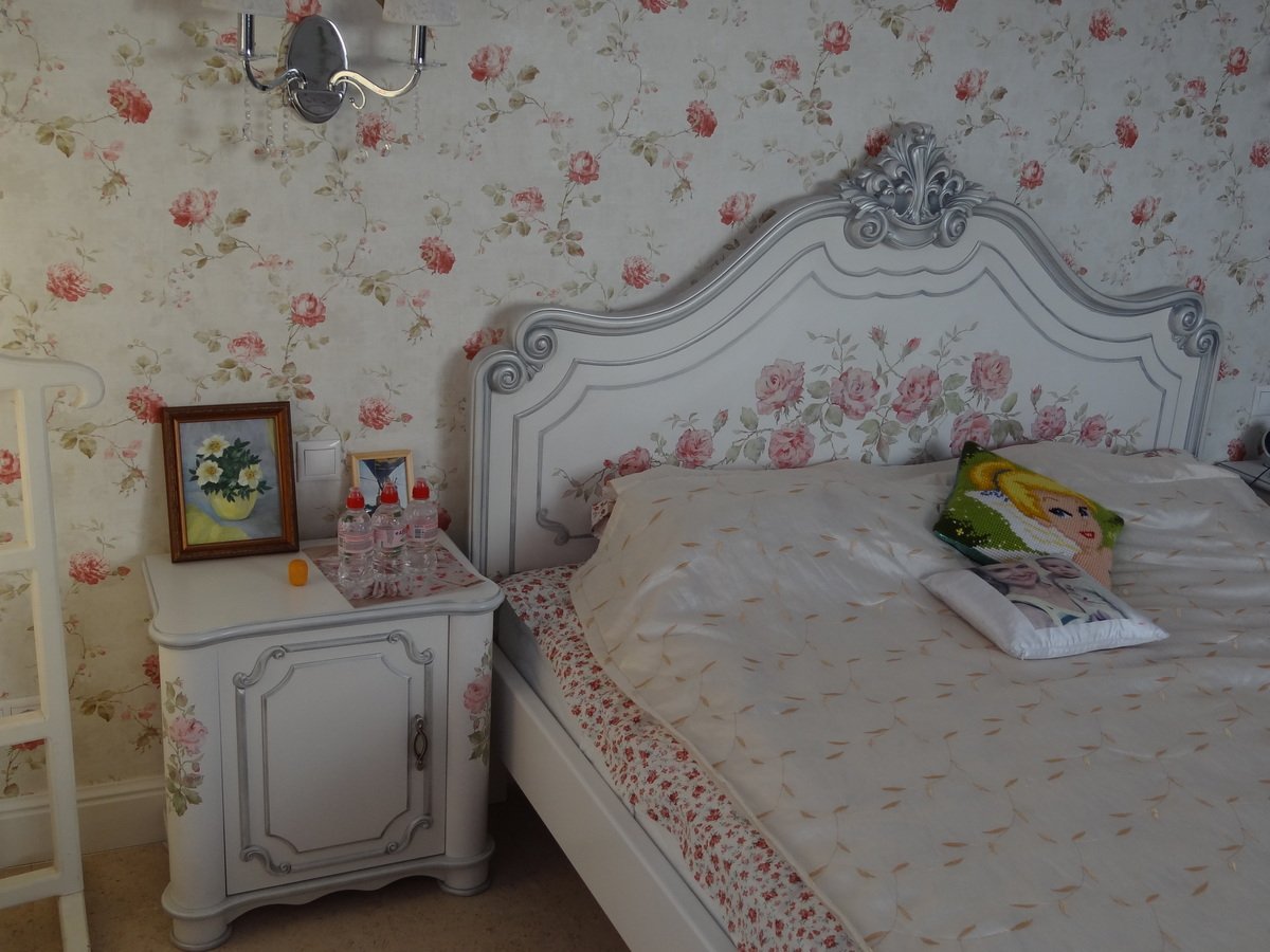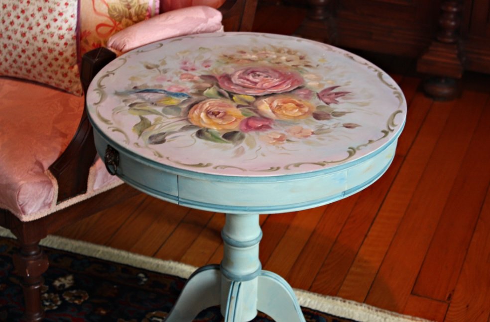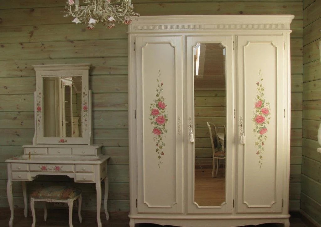 Shabby chic. Se caracteriza por suaves colores pastel. Muebles antiguos restaurados usados en tonos dorados. Las superficies los hacen parecer antigüedades, el patrón es borroso con bordes deshilachados.