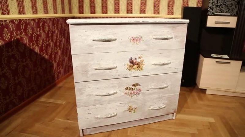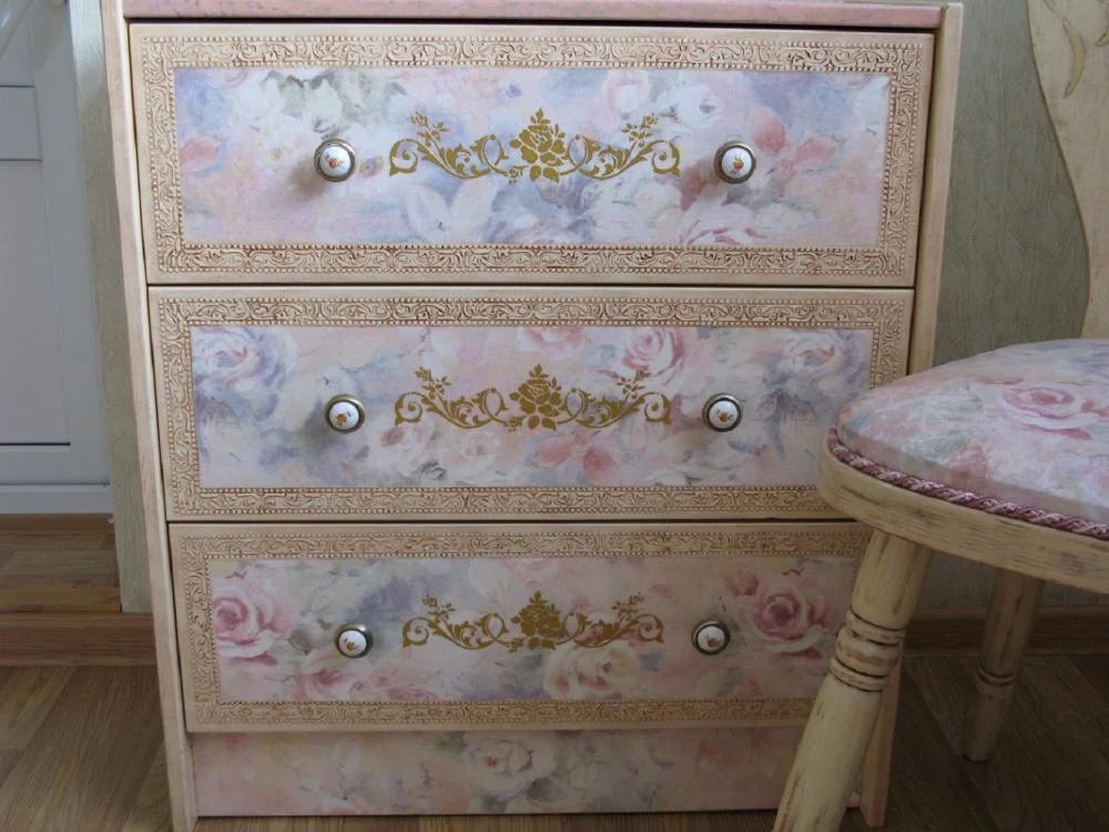 Una versión muy popular de la restauración de una cómoda antigua en el estilo de shabby chic. Esta es una decoración y envejecimiento simultáneo. Se puede realizar un decoupage simple con servilletas en cualquier superficie pintada, pero es mejor si es blanco, rosa, ensalada, azul o beige.