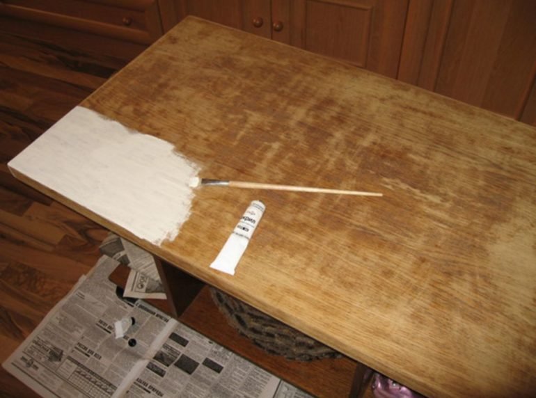 Limpiamos todas las partes de madera de barniz viejo y pintamos con papel de lija. Si la mesa es de plástico, simplemente desengrase con alcohol.