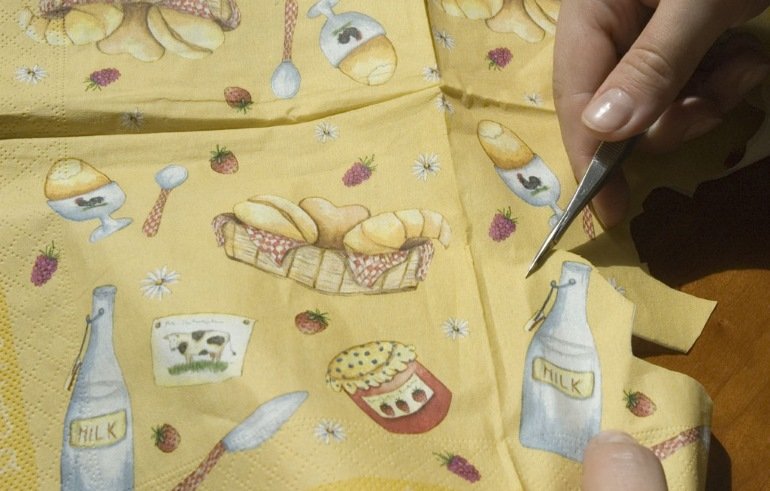 Las servilletas son el material más conveniente para el decoupage. Gracias al papel adelgazado, puede lograr transiciones imperceptibles en una superficie común. Es mejor elegir imágenes sofisticadas y románticas al estilo de Provenza, vintage. Los colores pastel crearán una atmósfera inimaginable de confort y tranquilidad.