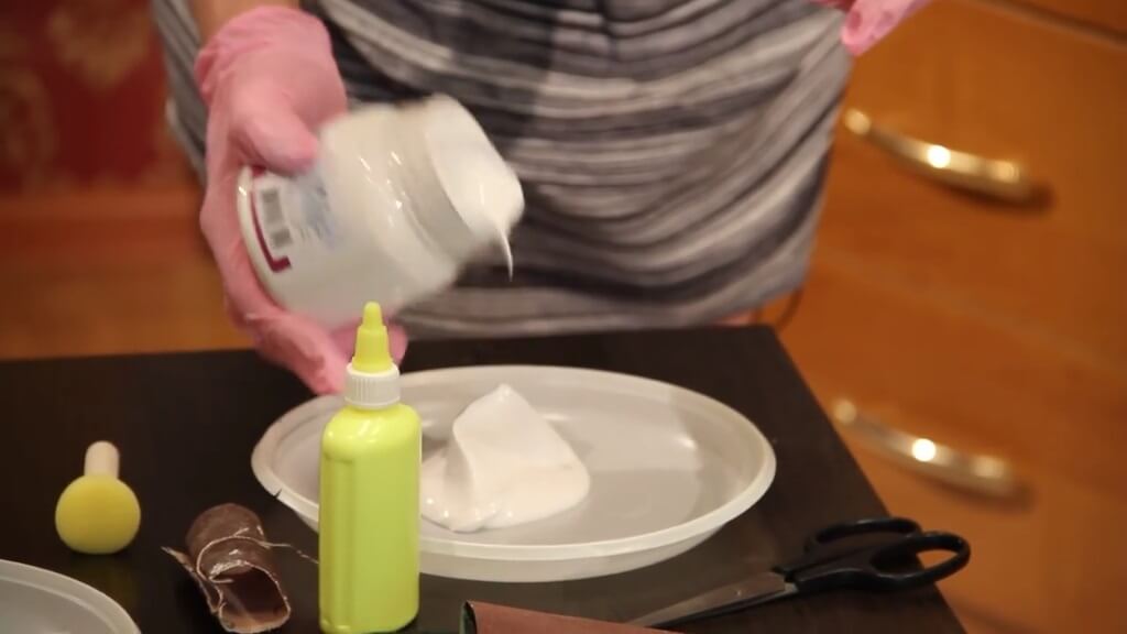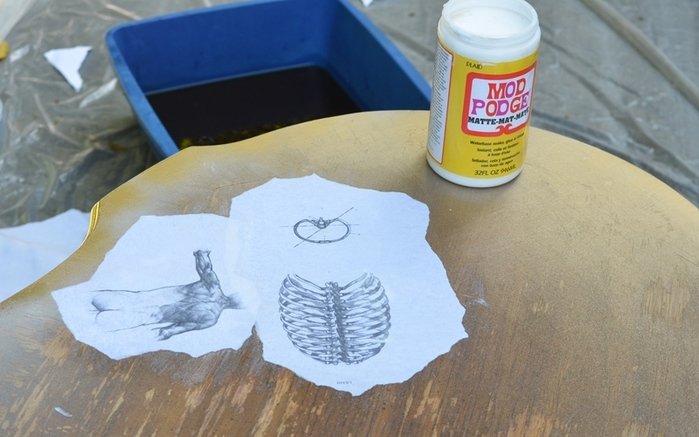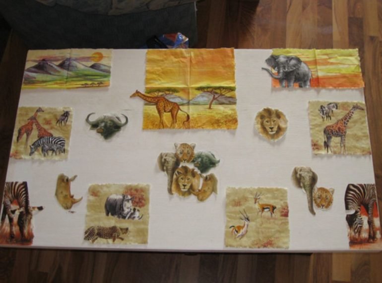 Si hay grietas o rebabas en las heces, se deben quitar y nivelar con papel de lija. Si las imágenes son transparentes, el producto puede pintarse. Mojamos las servilletas con agua, cubrimos con pegamento y aplicamos a la superficie. Si decide usar papel tapiz, entonces en el líquido deben mantenerse más tiempo, aproximadamente 1 minuto. Con un rodillo o brocha, empuje el aire hacia afuera. Por último, barniz.