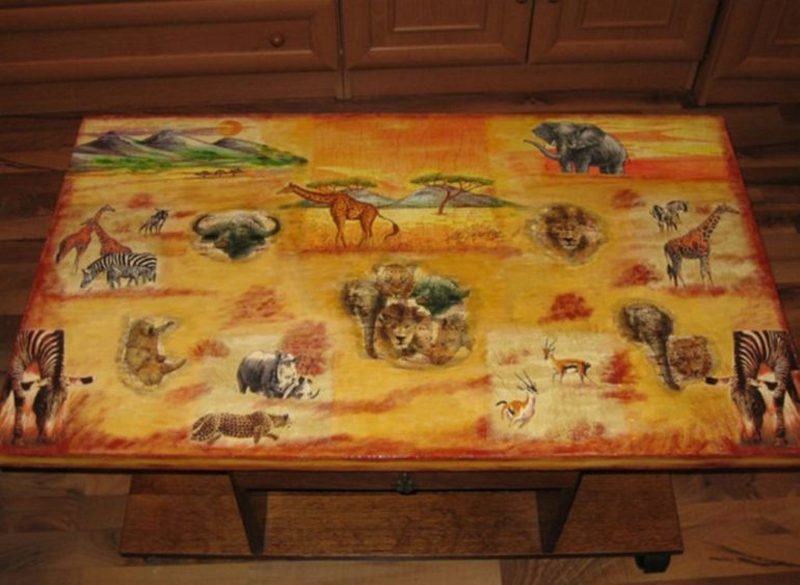 Puedes decorar una mesa de café en varias técnicas. El más popular es el decoupage con servilletas. Se pueden comprar productos de papel especiales con una variedad de motivos (vintage, fiestas temáticas, animales, naturaleza, grandes ciudades y más). También puede ser recortes de periódicos, revistas, mapas, fotografías. Pero debe tenerse en cuenta que es más difícil trabajar con material denso, debe diluirse antes de la fijación. Vestir una mesa de café con una técnica de servilleta se lleva a cabo en varias etapas: