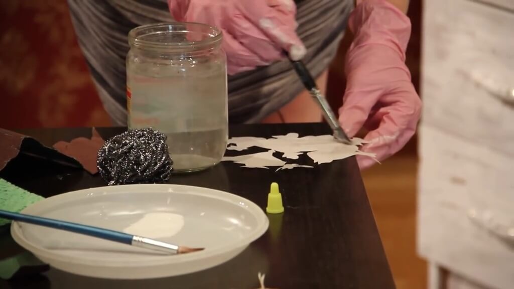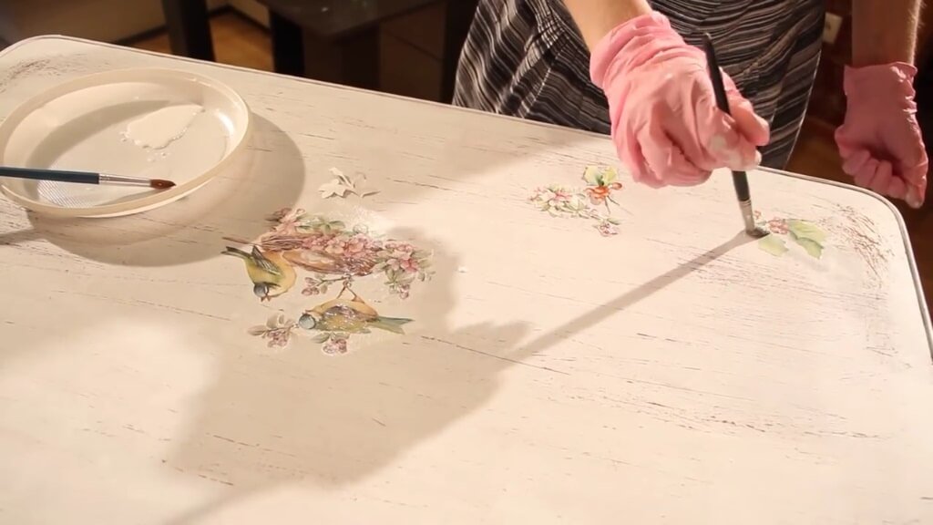 Después de completar el trabajo preparatorio, aplicamos un trozo de papel tapiz con la imagen hasta la superficie de la mesa. Antes de arreglar, la imagen debe alisarse cuidadosamente, se deben eliminar todos los pliegues e irregularidades. Mezcle el pegamento con agua y extiéndalo por toda el área del elemento de papel.