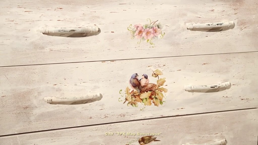 Mientras se seca la cómoda o la mesita de noche, preparamos servilletas para decoupage. Las imágenes delgadas se pueden reemplazar con fotografías, varias impresiones en la impresora. Ahora realizamos envejecimiento artificial. Limpiamos la pintura al azar con un raspador de metal para platos o papel de lija. Luego pegamos las imágenes con pegamento y lo aplicamos al árbol. Con un cepillo pequeño con pegamento, expulsamos el aire y fortalecemos los bordes. Cuando todas las servilletas están pegadas, queda por pulir la cómoda con barniz.