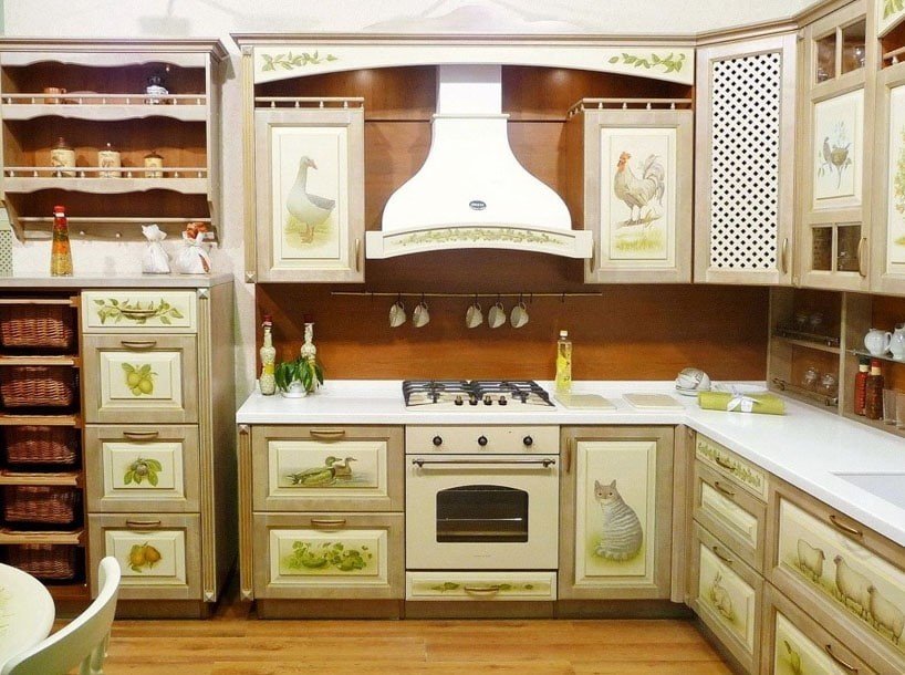 País El estilo rústico se caracteriza por el beige, marrón, blanco, azul. Se caracteriza por la superficie envejecida de los objetos. El patrón se selecciona de acuerdo con el ya existente en la tapicería de sillas, un sofá o en un mantel, cortina.