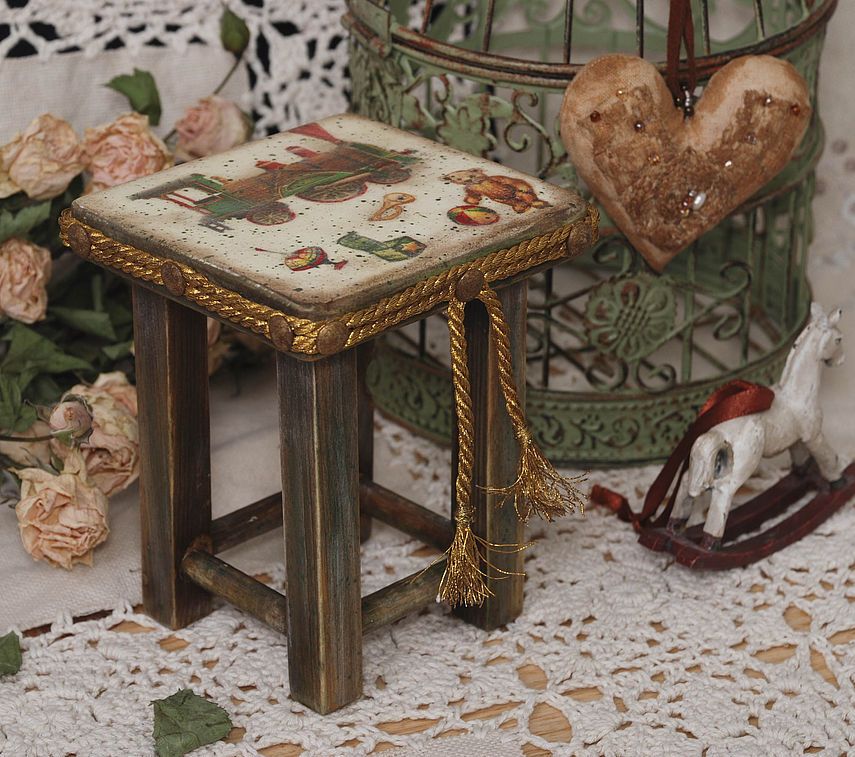 Puede lograr la combinación más armoniosa si decoupage el taburete con el papel tapiz que cubre las paredes de la habitación.