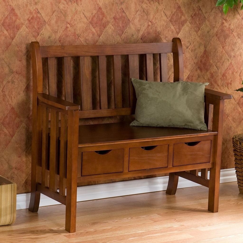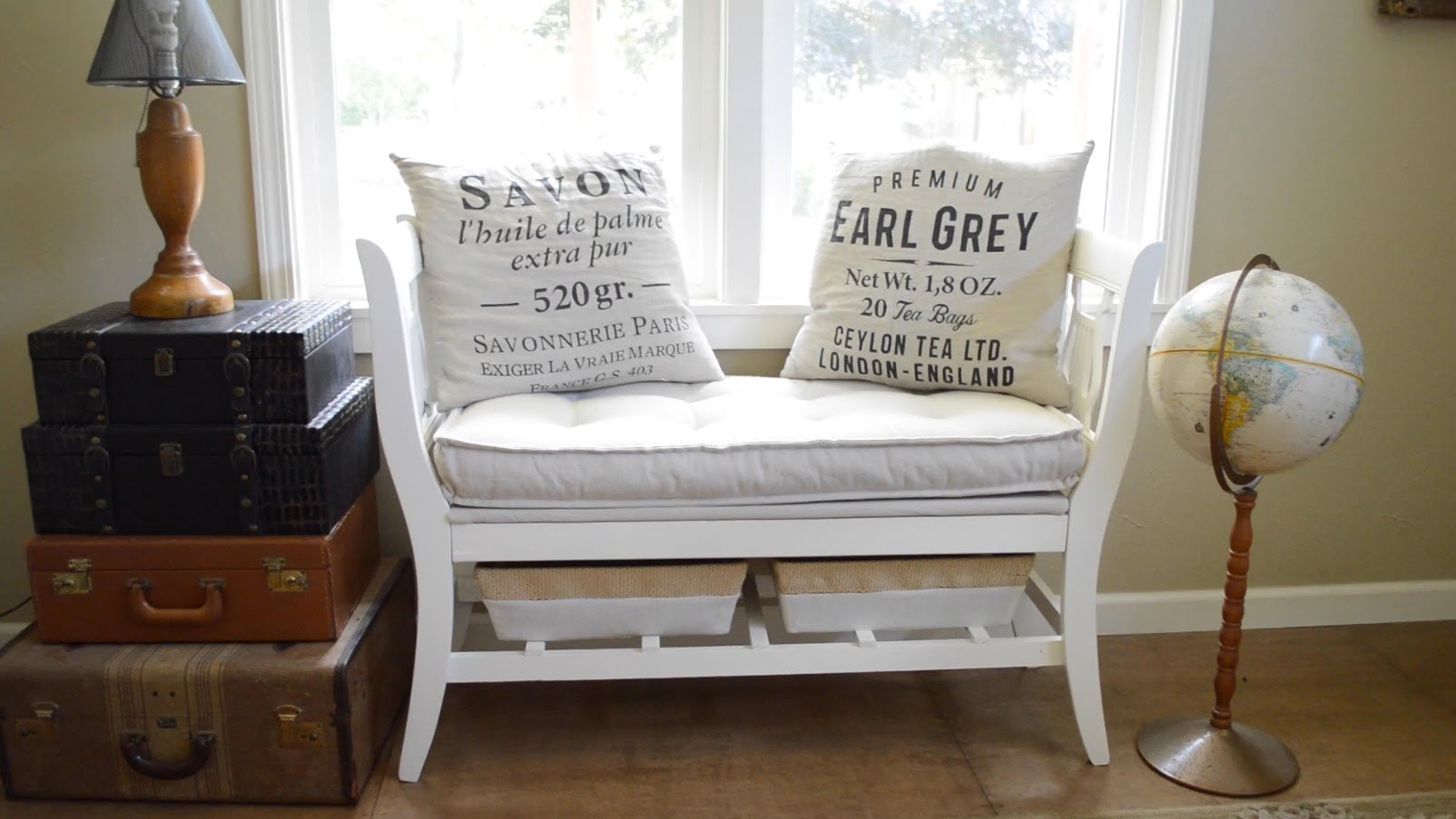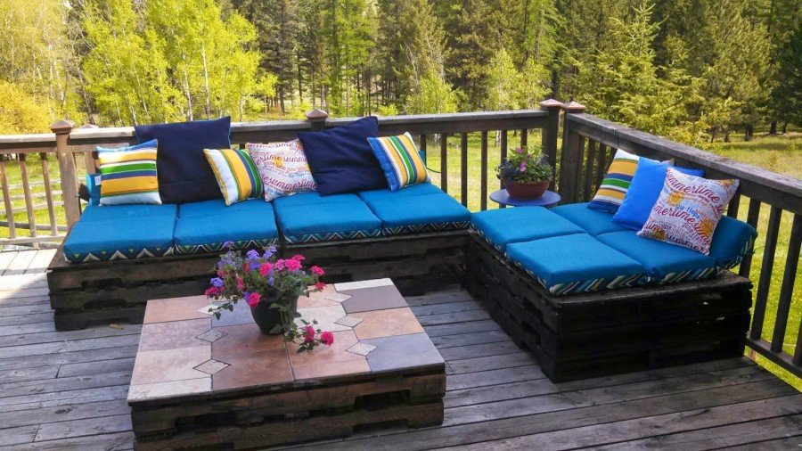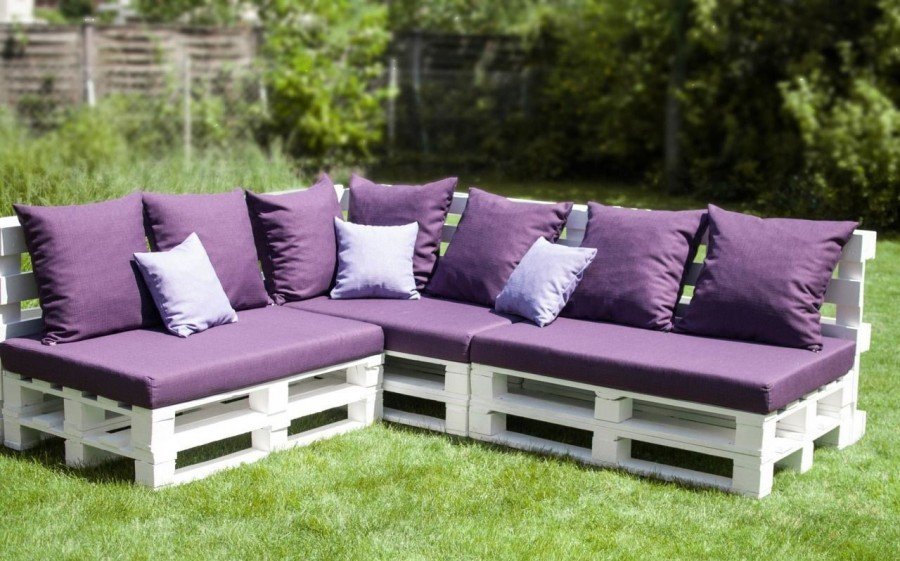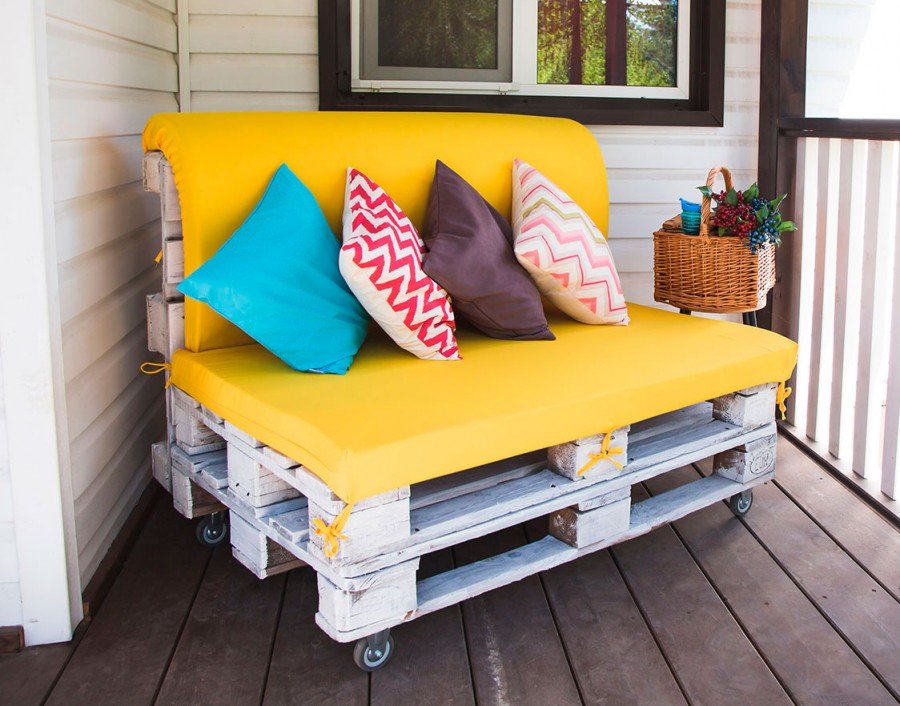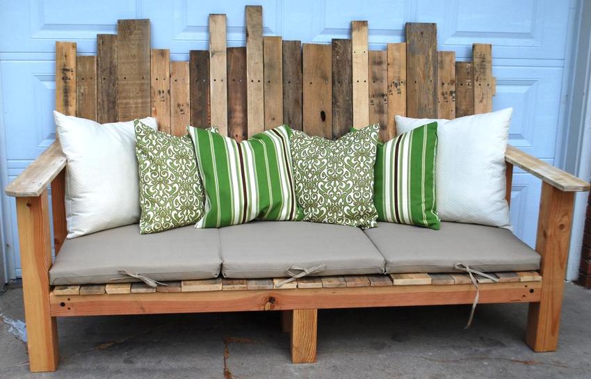 Los muebles deben estar en armonía con el interior de la habitación y los detalles suaves. Si la otomana está pintada con barniz, es mejor decorarla con textiles que imiten la textura de la arpillera, puede usar asientos brillantes y a cuadros. A un marco oscuro monofónico se acercarán almohadas brillantes. Un sofá de paletas en el país se verá como en casa, si hace tapicería con un estampado floral.