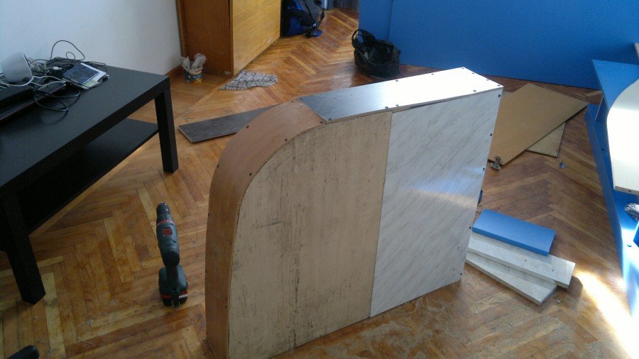 El montaje del diseño modular comienza con los reposabrazos. Son estos, los detalles más pequeños que necesitan atención especial. Para hacerlos perfectamente lisos, simétricos, debe seguir claramente el dibujo y cortar cuidadosamente el tamaño de los tableros laminados. Los tornillos autorroscantes se utilizan para conectar piezas.