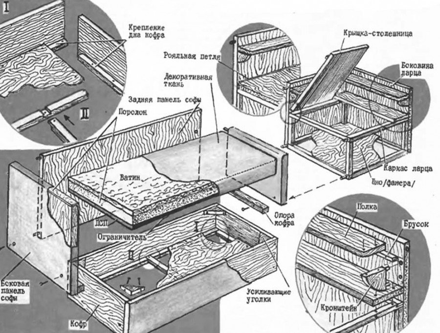 En primer lugar, debe preparar madera para el marco de madera del libro (asientos, respaldos, reposabrazos, cajones para la ropa). Giramos las barras, reforzamos con rieles transversales, clavamos una hoja de madera contrachapada en la parte inferior. Las celdas resultantes serán cajones en el sofá.
