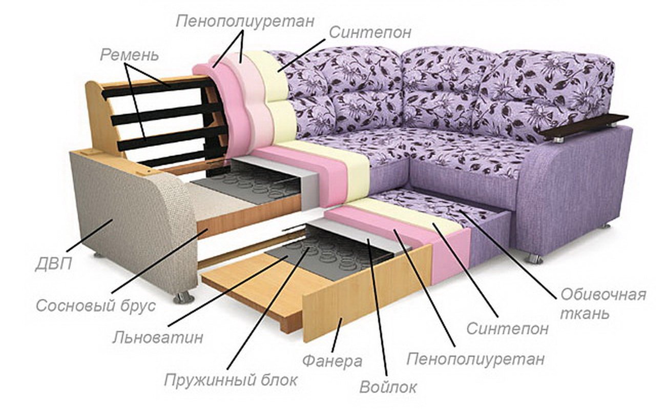 Hay muchos esquemas con diversas formas y métodos de tapicería para fabricantes de muebles para principiantes, según los cuales puede crear fácilmente una verdadera obra maestra. Los componentes principales de un sofá cama son los siguientes elementos: