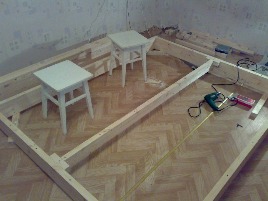 Es mejor hacer la base de madera, una viga de madera blanda, aglomerado, aglomerado, madera contrachapada. Para trabajar en casa, necesitará un gran espacio, un conjunto de herramientas necesarias (sierra circular, grapadora para muebles, destornillador).