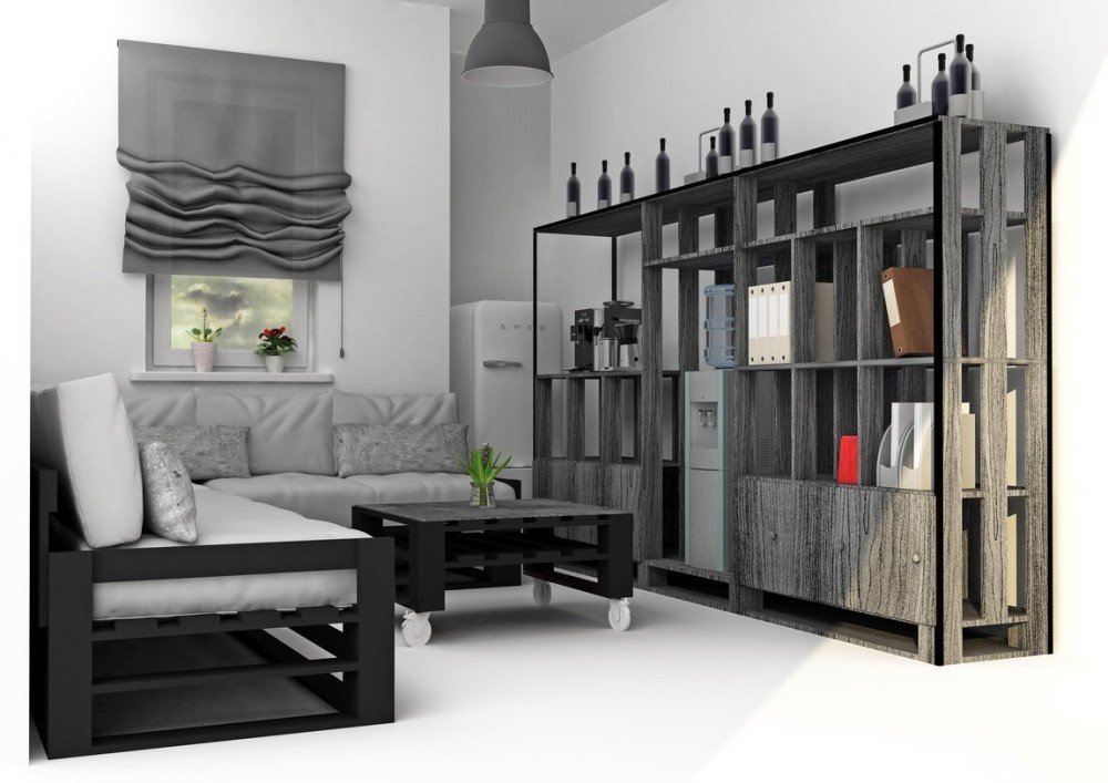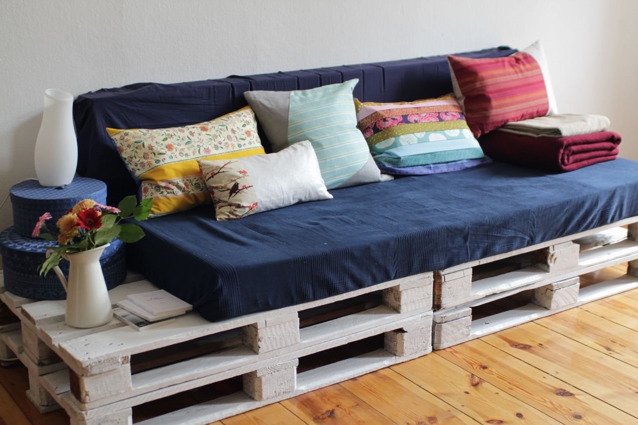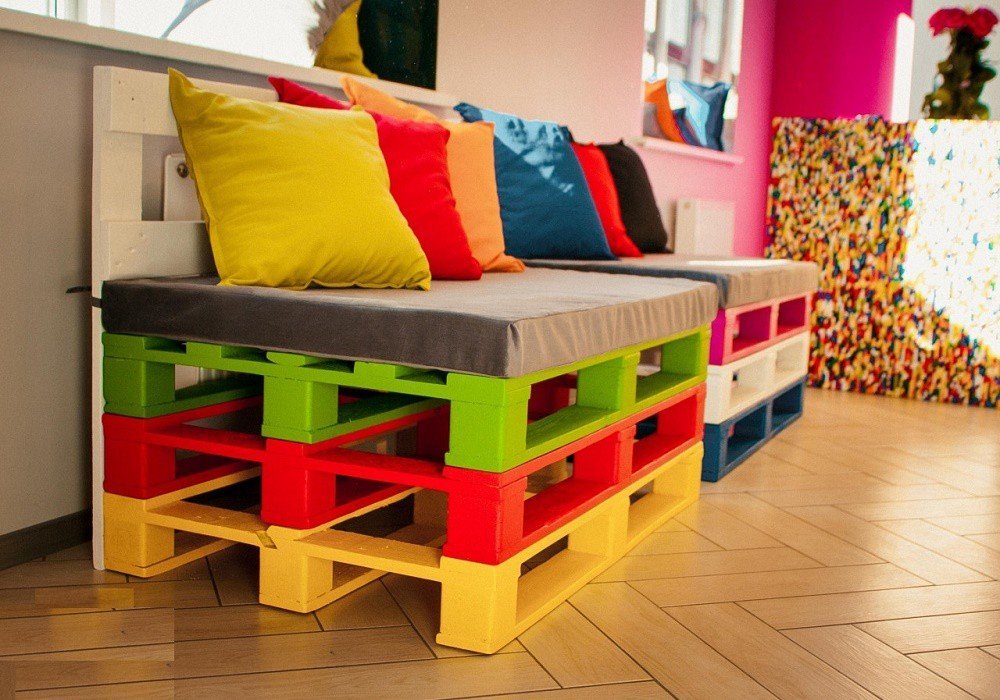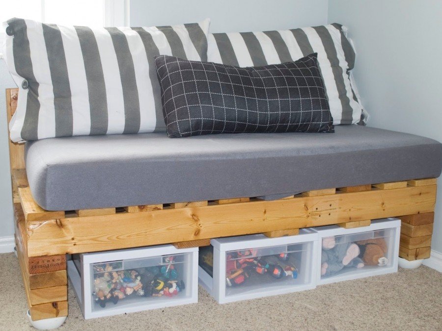 Además del diseño interior, el sofá de palets es muy funcional. Es conveniente de usar. Habiendo hecho un asiento de espuma suave y almohadas, es fácil convertirlo en otra litera. Puede obtener estantes adicionales para almacenar artículos para el hogar, si cubre una hoja de particiones de madera contrachapada.