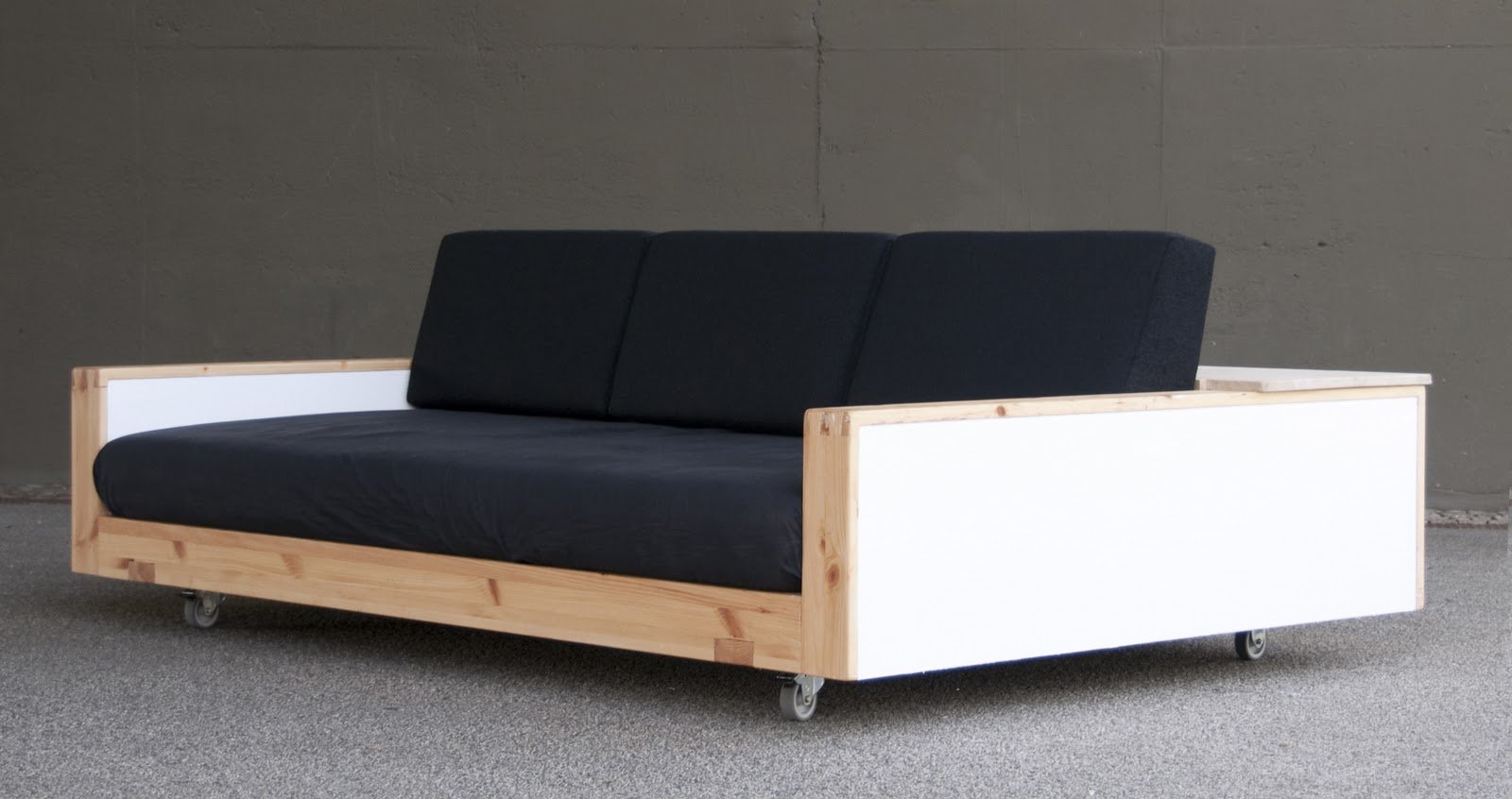 El montaje del sofá puede realizarse mediante soldadura o atornillado. Siguiendo las instrucciones paso a paso, debe comenzar conectando el marco, instalando las patas, hacia atrás. En la etapa final, se colocan laminillas y barras transversales. Desde abajo es posible sujetar cajas desplegables. Puede decorar el sofá con pintura minimalista o revestir madera, textiles.