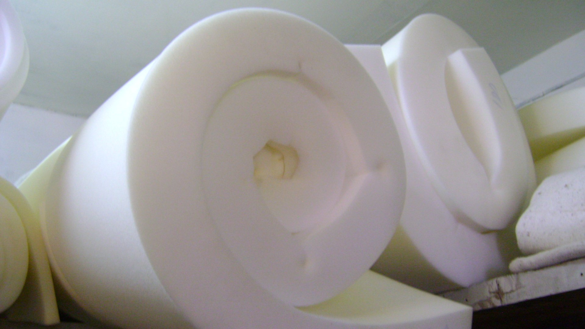 - De la lámina estándar de caucho de espuma HR 3535, cuyas dimensiones son 160x200x4 cm (largo, ancho, alto), cortamos el tamaño requerido, por ejemplo, en el caso bajo consideración 160x90x4 - la base, 160x60x4 - la segunda capa (asiento), 160x30x4 - la segunda capa (respaldo), 160x450x4 - espalda. Para formar almohadas para cada uno de estos componentes, necesita 6 hojas para obtener una altura de sofá de 50 cm.