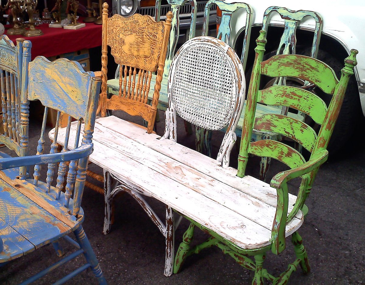- Para el trabajo, necesitará cuatro sillas con respaldos curvos, tornillos y barniz. Desmontamos dos objetos, las patas restantes se cortan de las patas delanteras. Eliminamos el antiguo revestimiento de barniz con papel de lija de todos los elementos de trabajo del diseño futuro. Adjuntamos barras transversales desmontadas de la parte media a las sillas sin patas. Los respaldos enteros juegan el papel de paredes laterales. Cubrimos el sofá con barniz e instalamos rieles multicolores en lugar de los asientos.