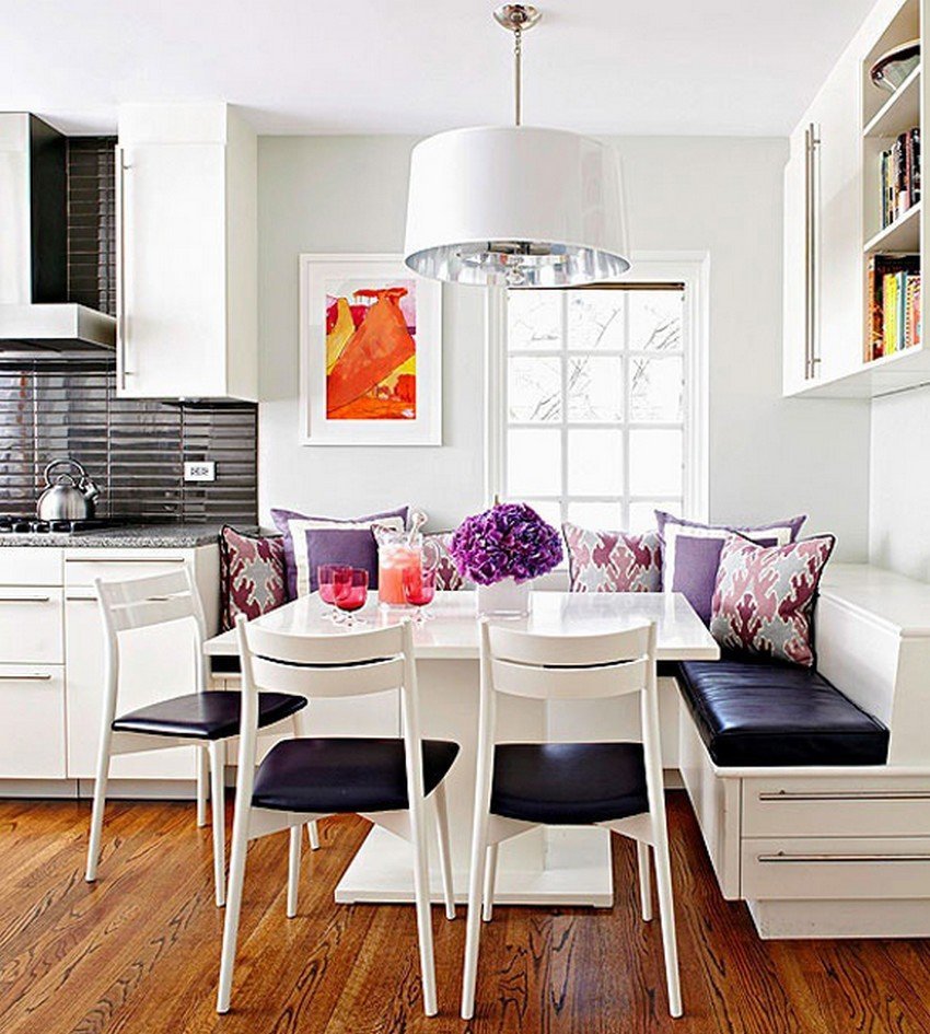 La combinación de diferentes texturas y tonos ayudará a ajustar el atributo de la cocina en la esquina donde el diseñador necesita un juego completo de contrastes. Las almohadas simples también son un elemento decorativo. Se pueden adaptar al tono o, por el contrario, hacerlos lo más expresivos posible en el contexto general.