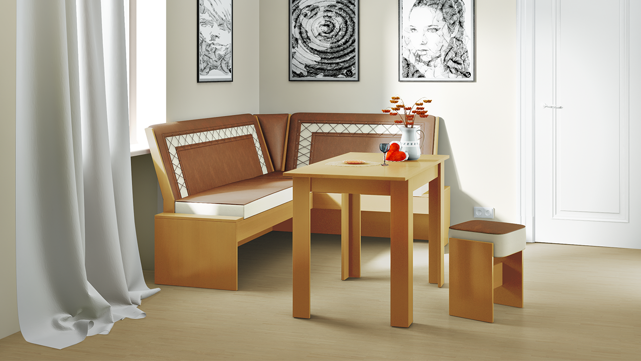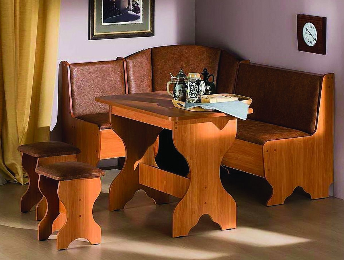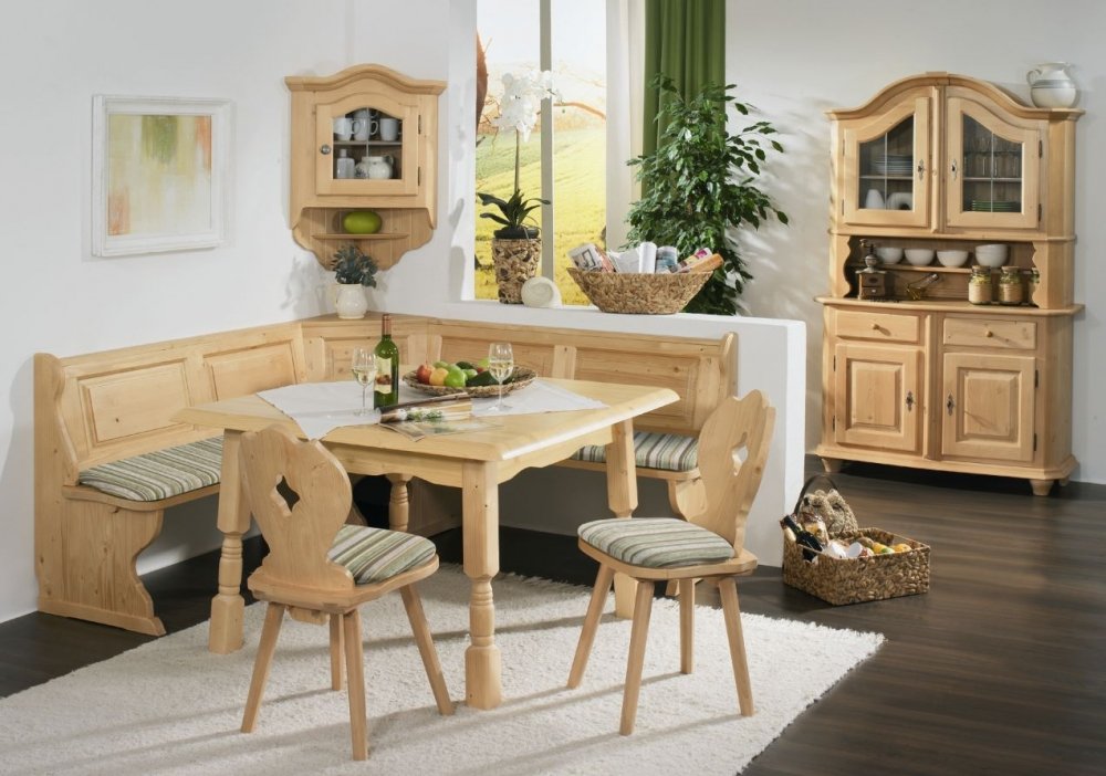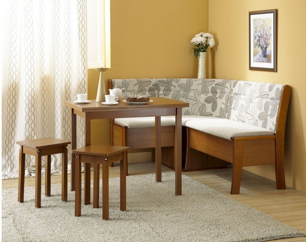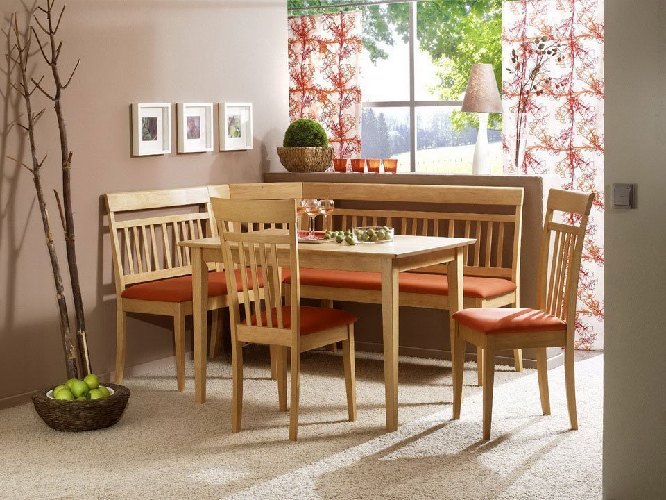 Un rincón de madera puede ser un complemento para cualquier refrigerio o lugar en la casa. El material para este producto es pino. La versión angular de los muebles para Jruschov se combina con cortinas florales, paredes lisas y bonitos artículos de decoración.