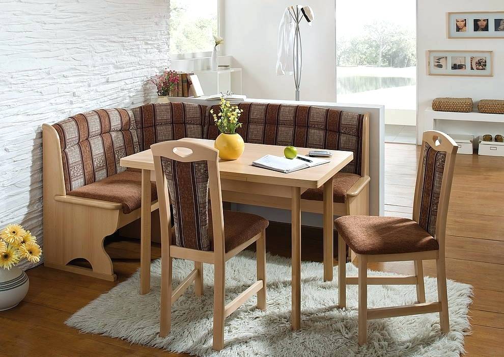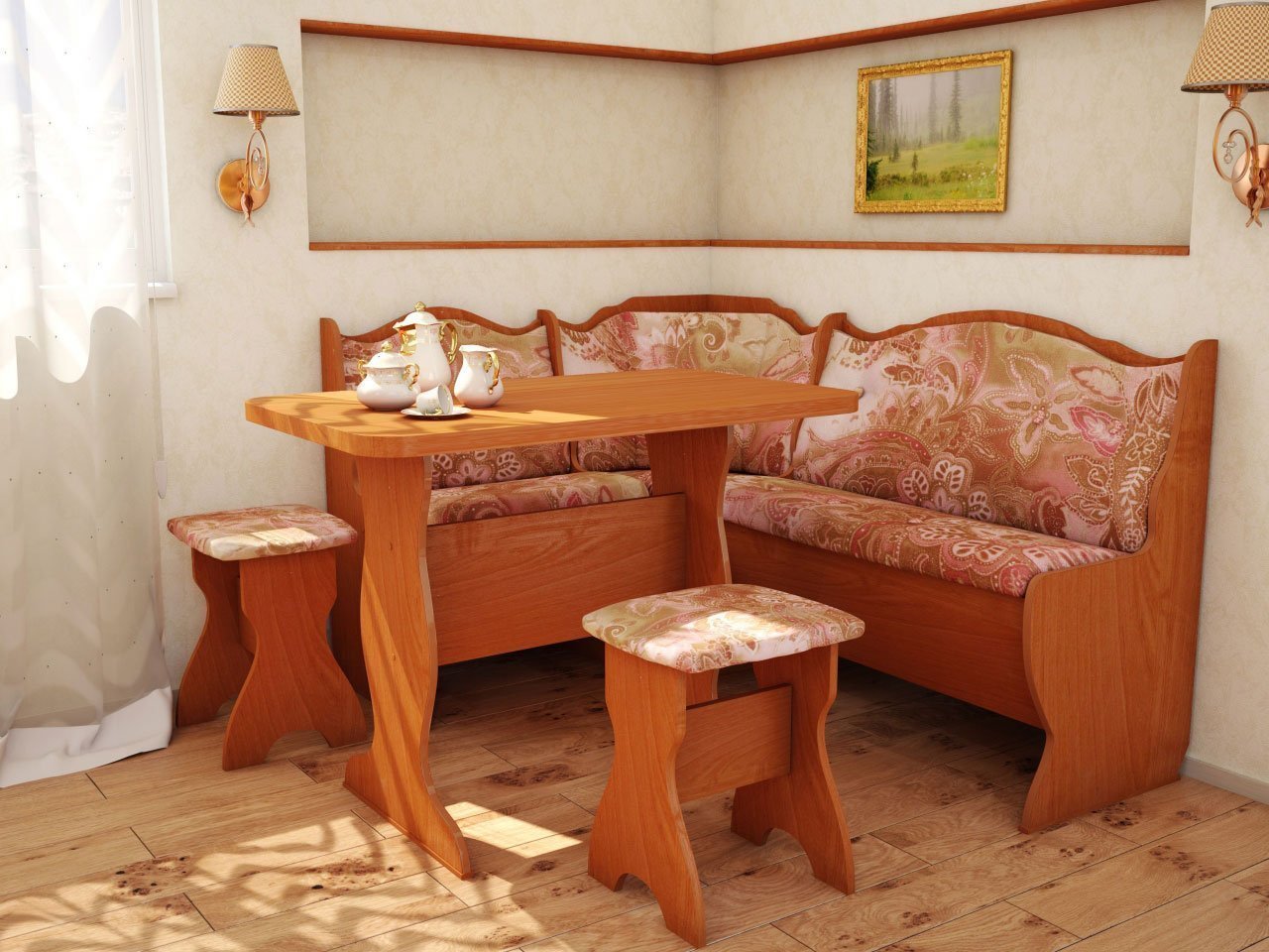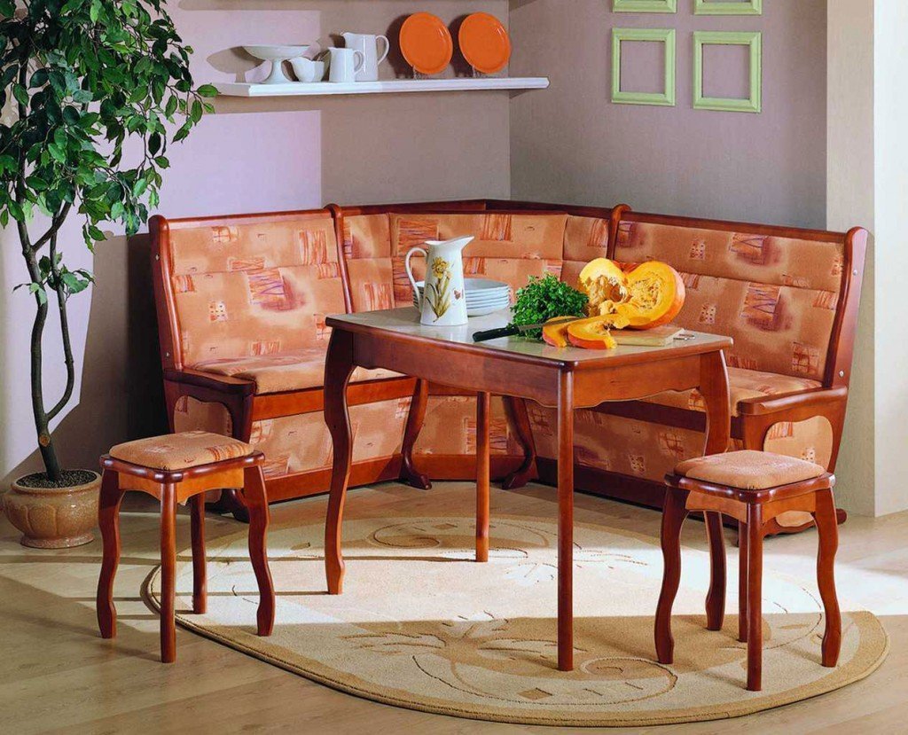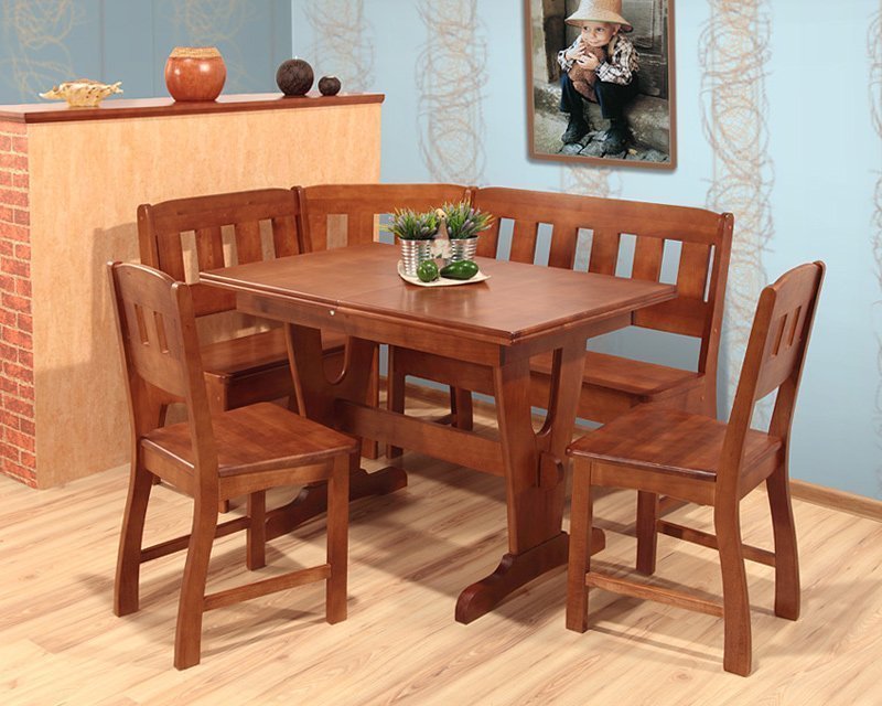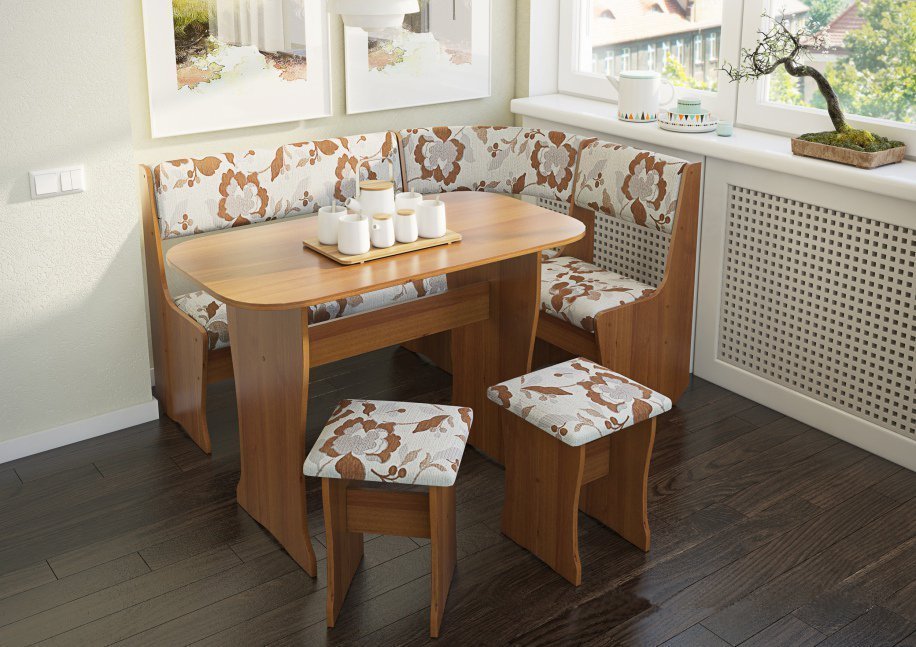 Un rincón de madera puede ser un complemento para cualquier refrigerio o lugar en la casa. El material para este producto es pino. La versión angular de los muebles para Jruschov se combina con cortinas florales, paredes lisas y bonitos artículos de decoración.