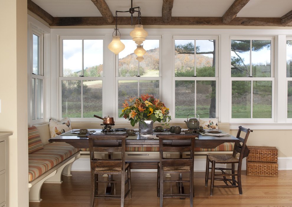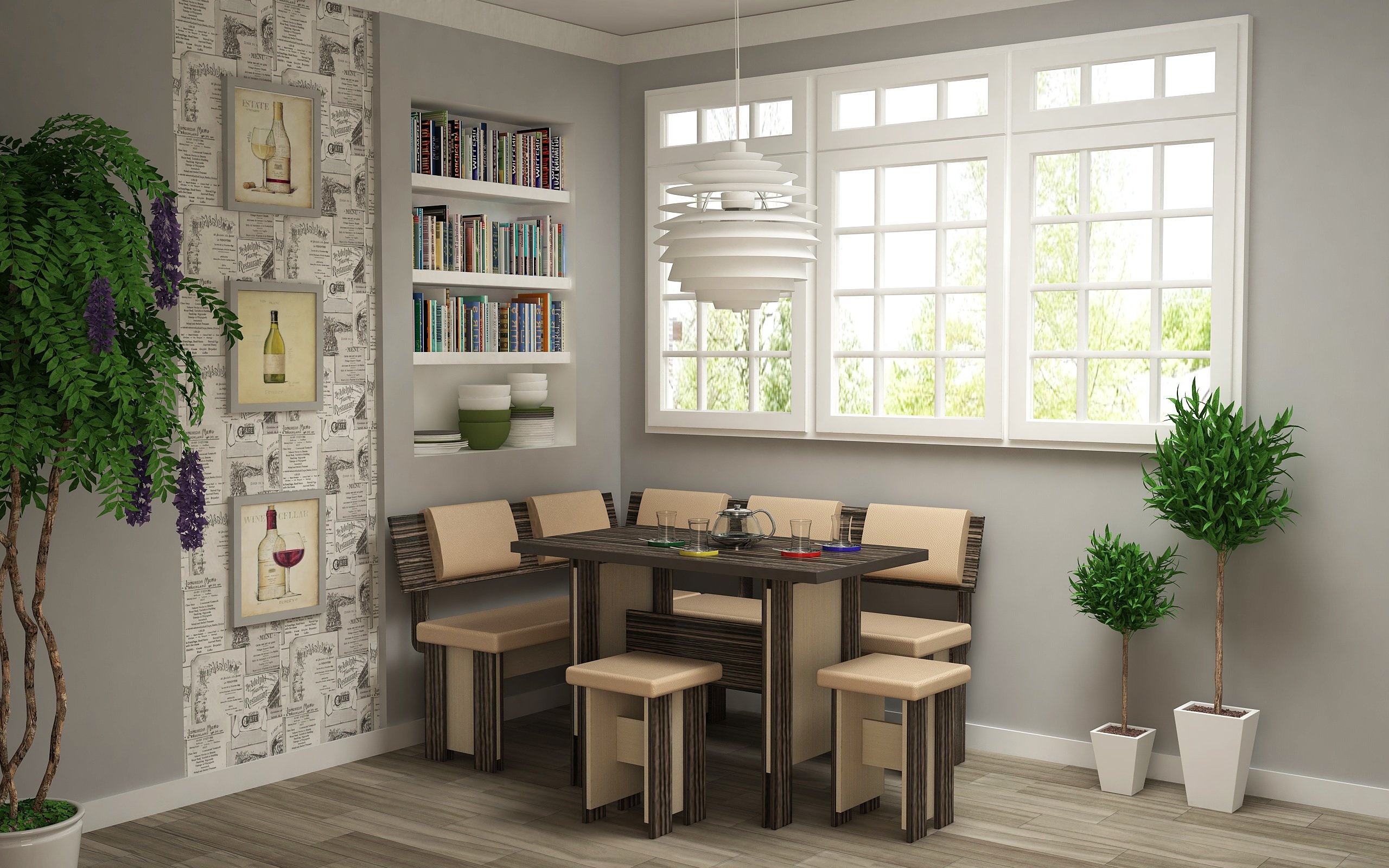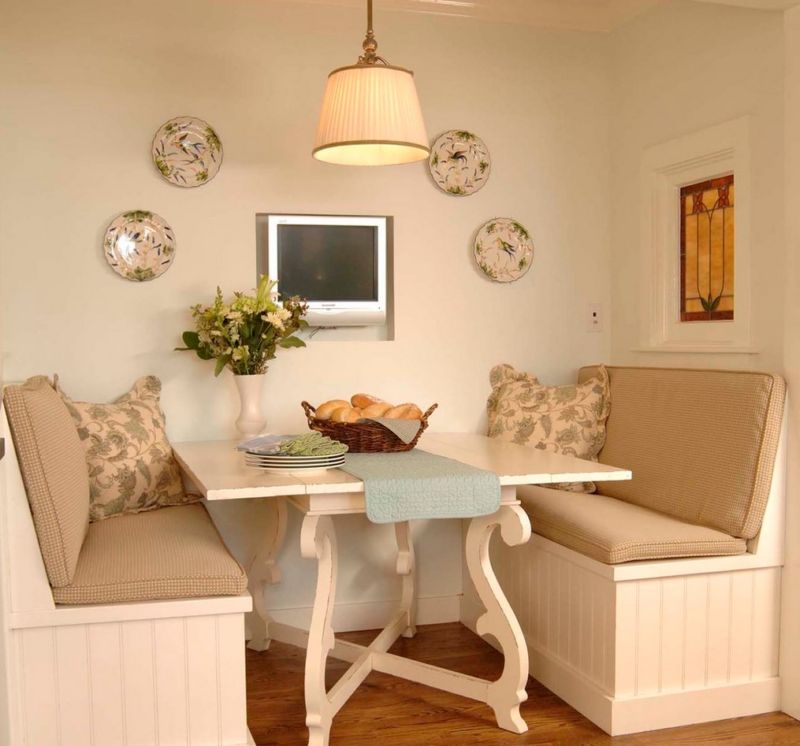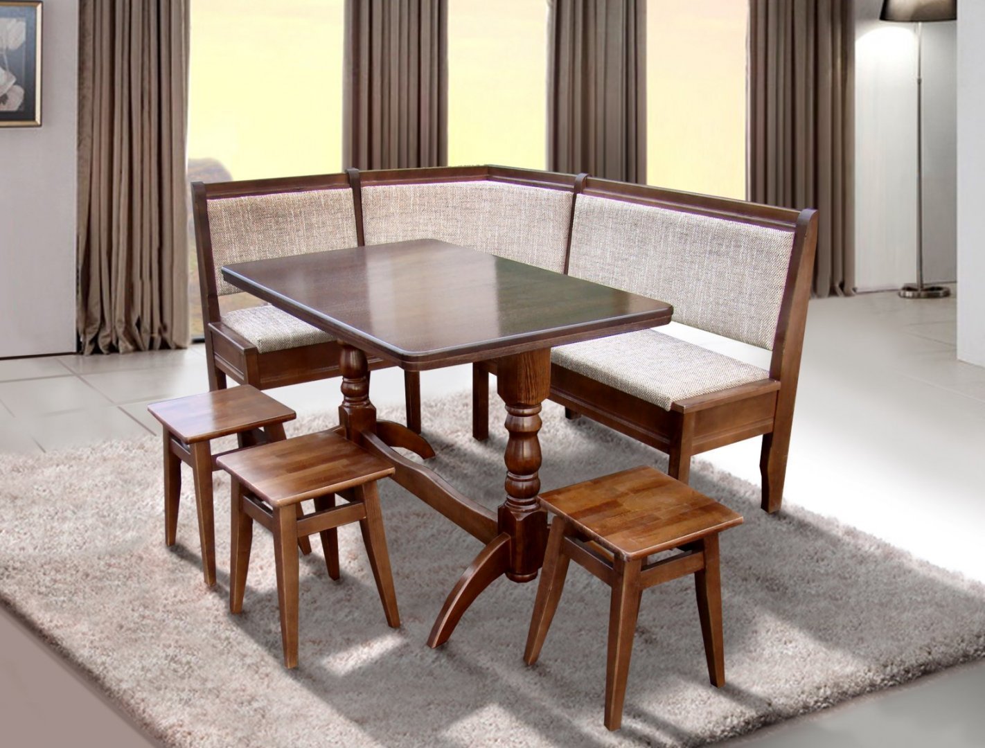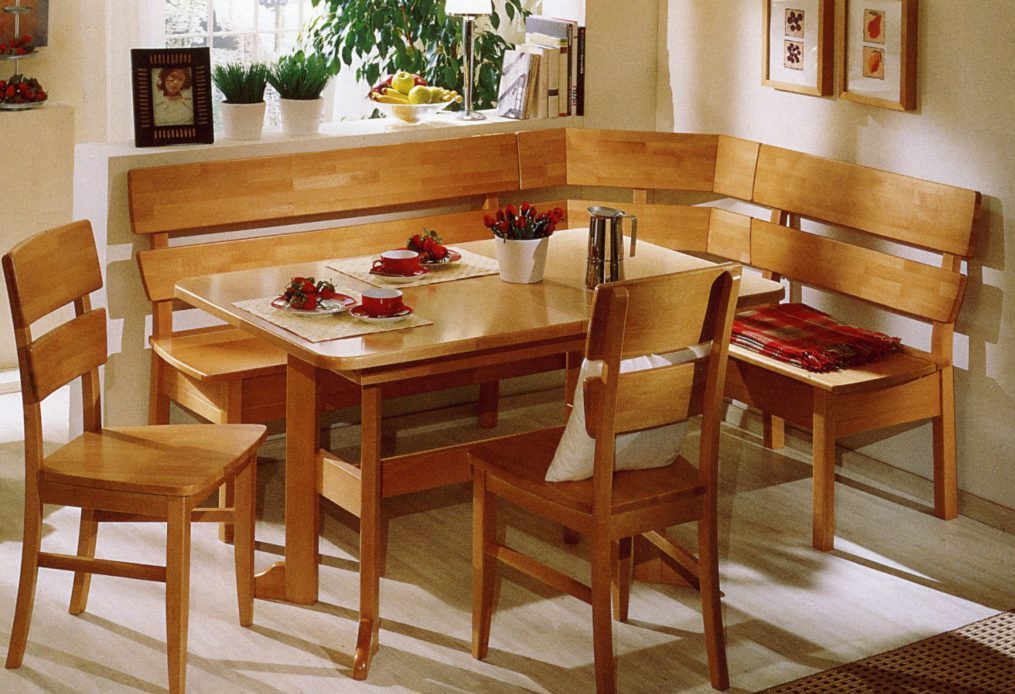 Un rincón de madera puede ser un complemento para cualquier refrigerio o lugar en la casa. El material para este producto es pino. La versión angular de los muebles para Jruschov se combina con cortinas florales, paredes lisas y bonitos artículos de decoración.