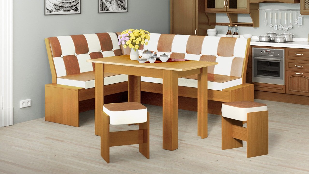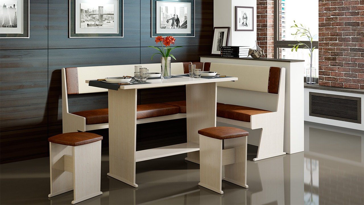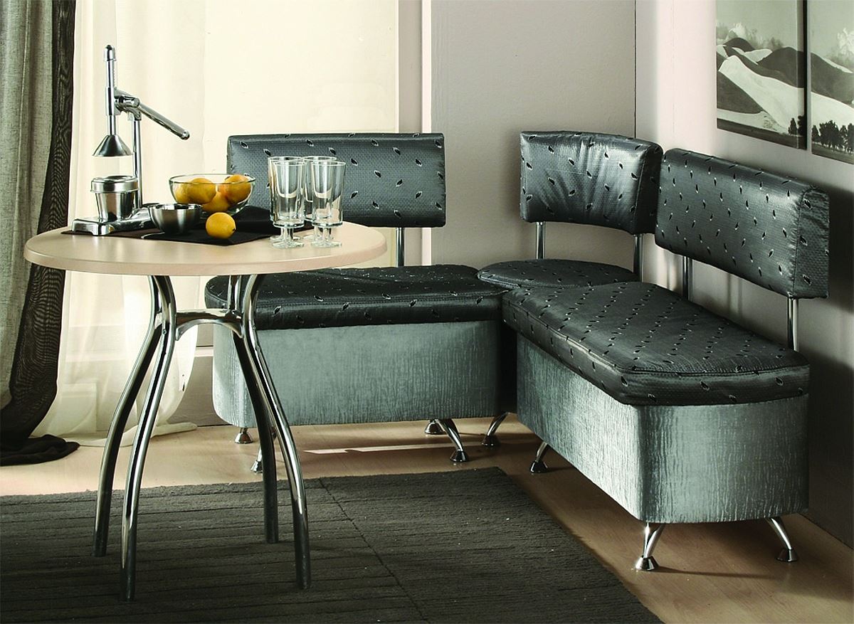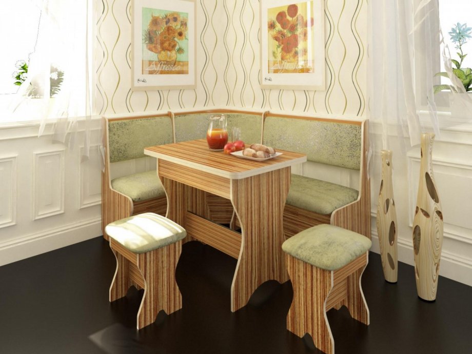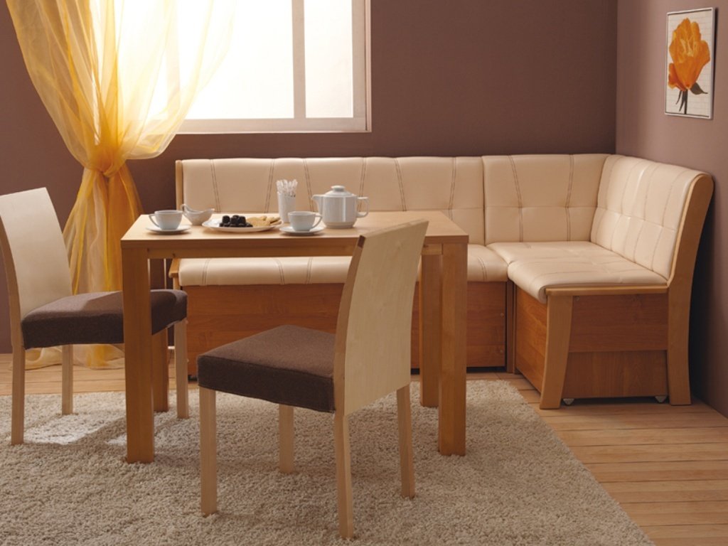 Los muebles de esquina son mucho más fuertes, más prácticos, más baratos que los grupos de restaurantes de pleno derecho. Un rincón en la cocina le da a la habitación comodidad y confort. Sirve como compartimento para almacenar cereales, verduras e incluso piezas de trabajo. La mayoría de los modelos incluyen no solo asientos y una mesa. Este grupo incluye dos o tres sillas, que, si es necesario, se pueden empujar debajo de la encimera.