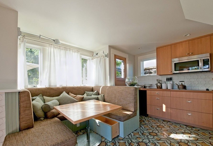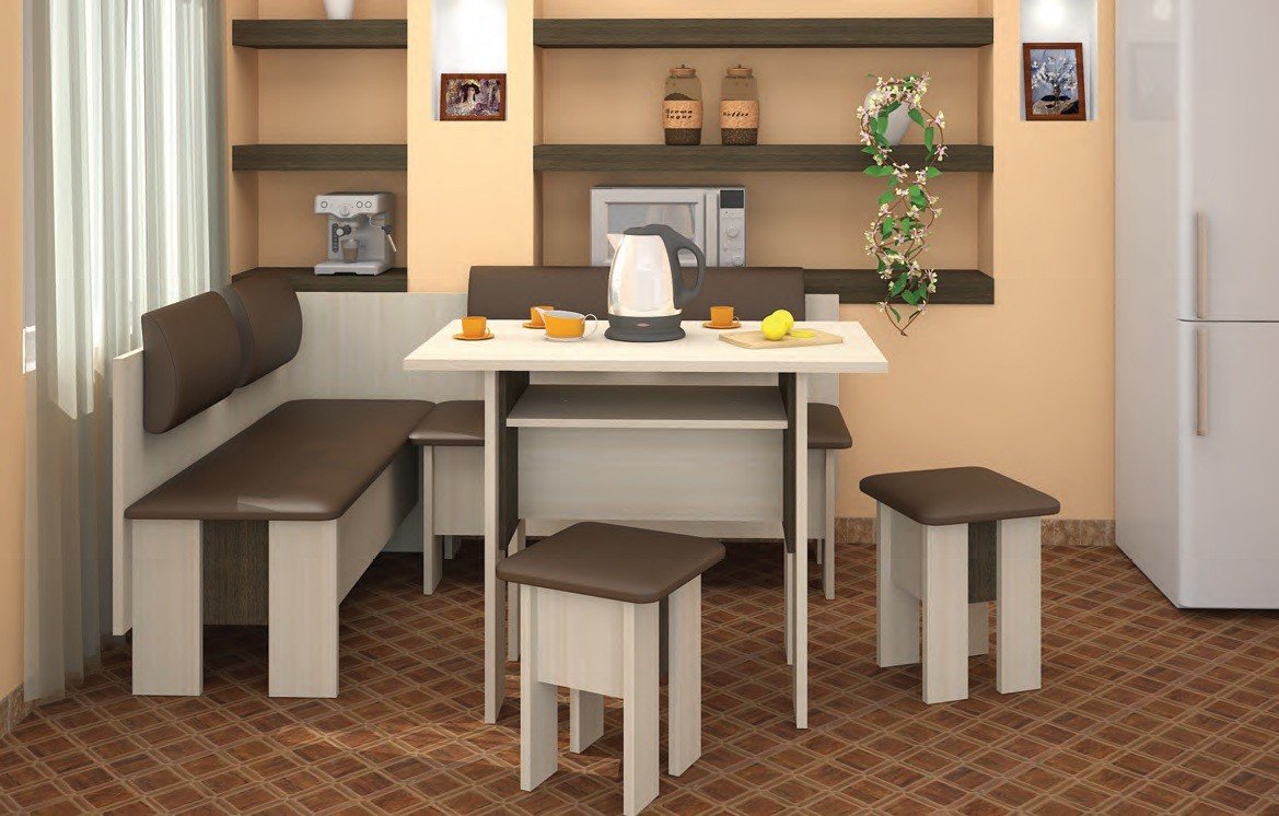 La esquina en sí también puede ser un transformador de muebles. Es capaz de convertirse en una litera, como un sofá de pleno derecho, o reemplaza un armario para almacenar pequeñas bagatelas de cocina.