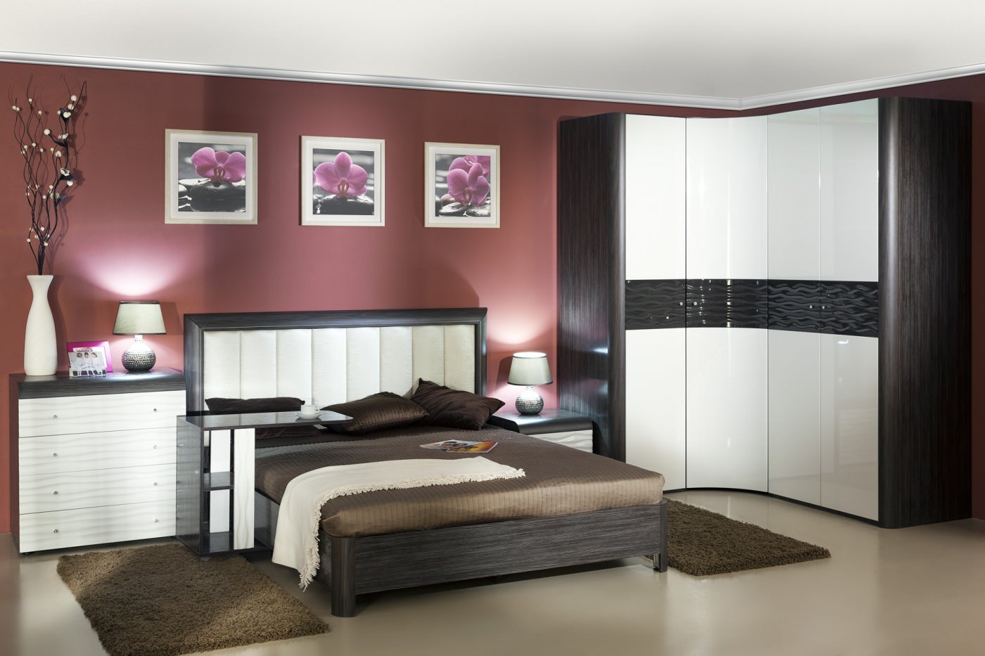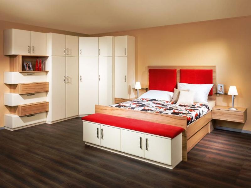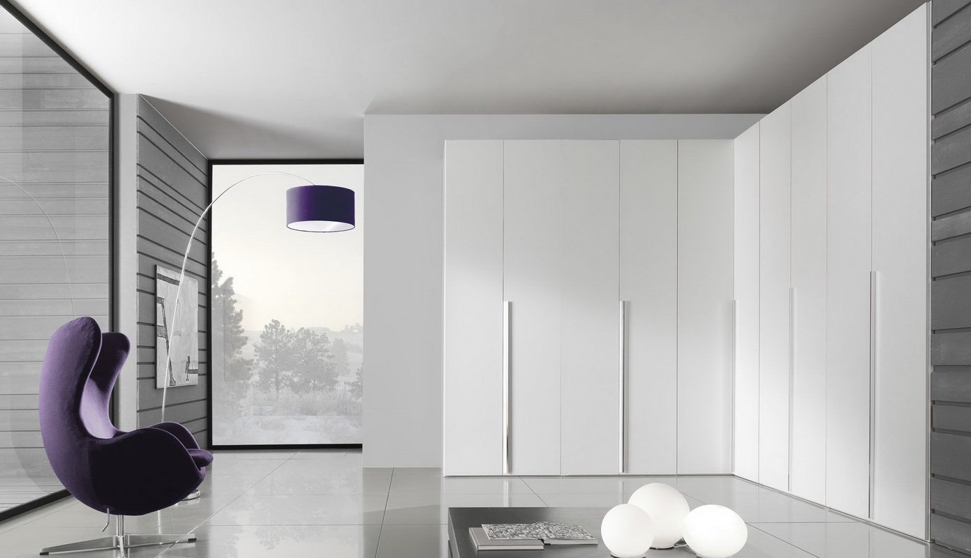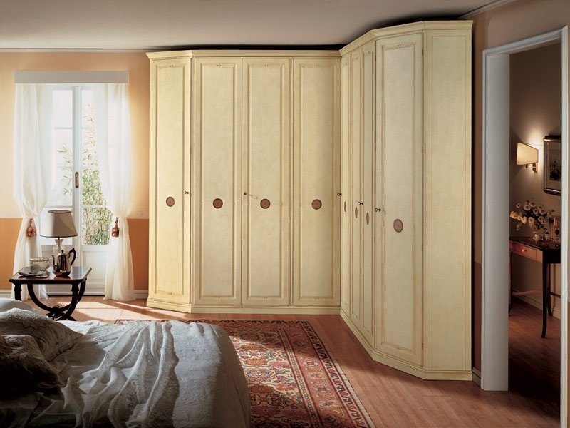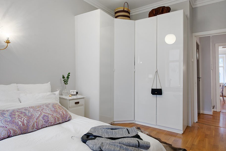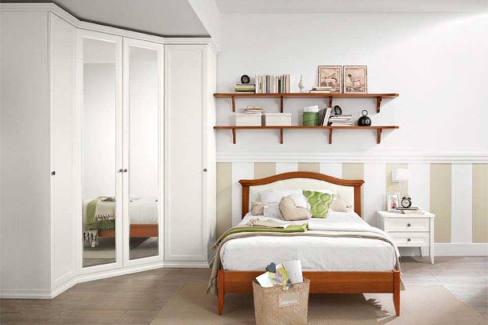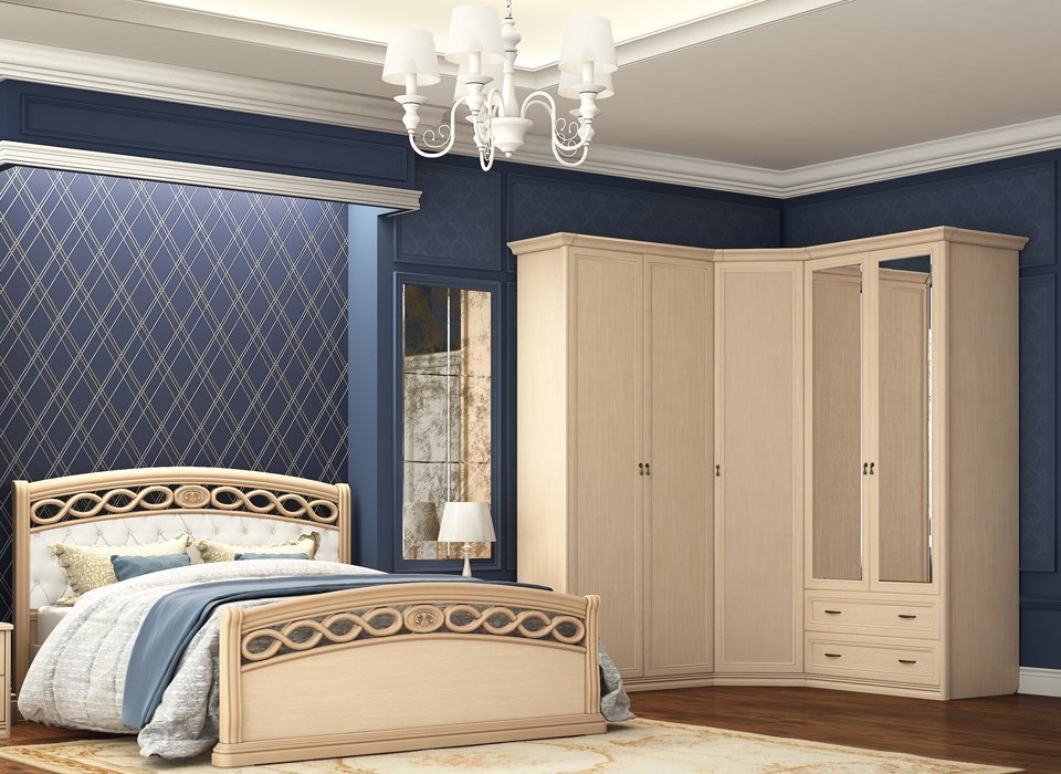 Todos estos colores se encuentran en la variedad de muebles de dormitorio. En las versiones clásicas, los gabinetes de esquina se ensamblan con paneles de MDF y tableros de partículas que simulan la madera clara. Fusiona orgánicamente con el minimalismo, los muebles blancos de alta tecnología, modernos y de estilo escandinavo, decorados con vidrio o espejo. La cama "elevada" (diseño suspendido) está en armonía con el armario de aire blanco. El tipo radial se combina con camas redondas. El armario generalmente se coloca cerca de la pared más cercana al lado de la cama, para que los propietarios puedan tomar fácilmente lo correcto.