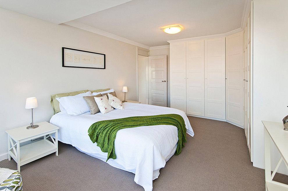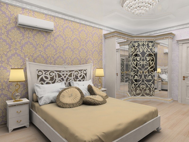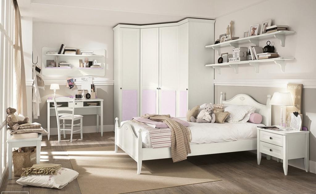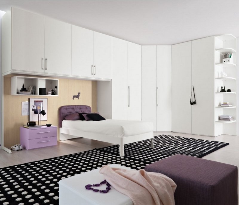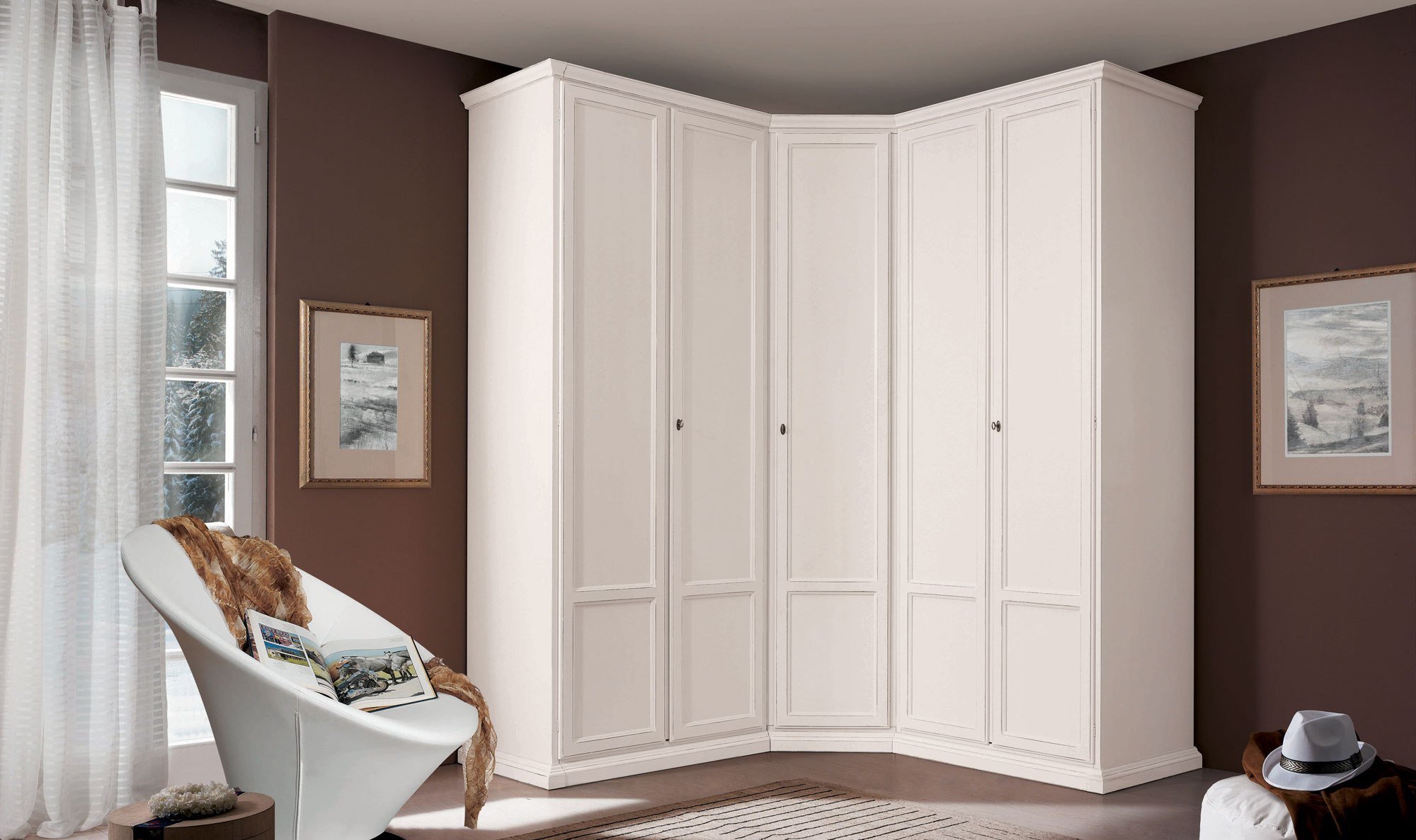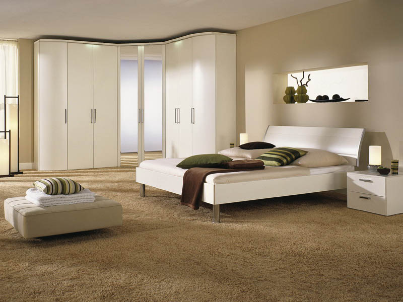 Todos estos colores se encuentran en la variedad de muebles de dormitorio. En las versiones clásicas, los gabinetes de esquina se ensamblan con paneles de MDF y tableros de partículas que simulan la madera clara. Fusiona orgánicamente con el minimalismo, los muebles blancos de alta tecnología, modernos y de estilo escandinavo, decorados con vidrio o espejo. La cama "elevada" (diseño suspendido) está en armonía con el armario de aire blanco. El tipo radial se combina con camas redondas. El armario generalmente se coloca cerca de la pared más cercana al lado de la cama, para que los propietarios puedan tomar fácilmente lo correcto.