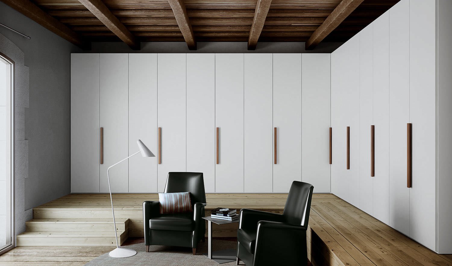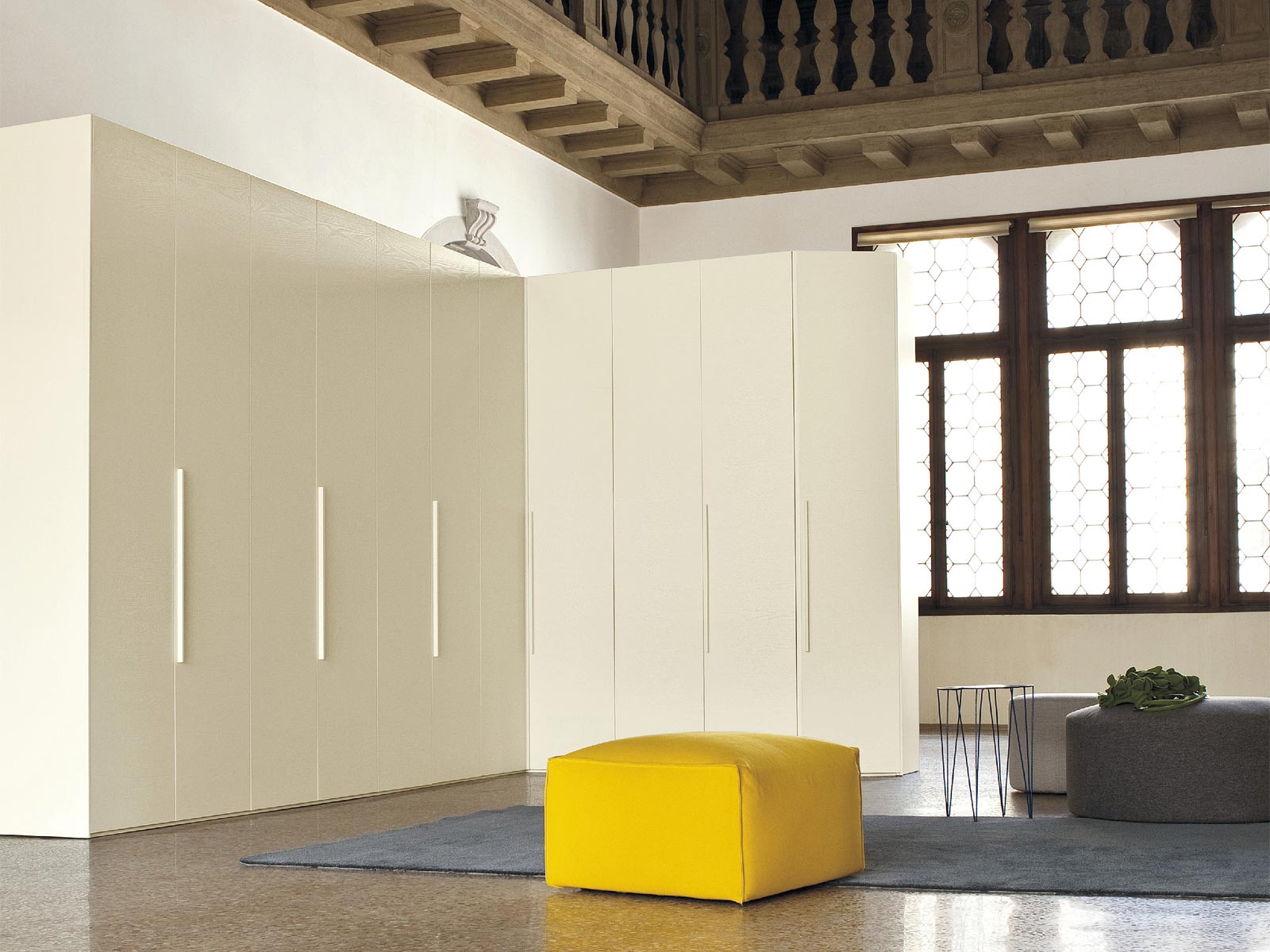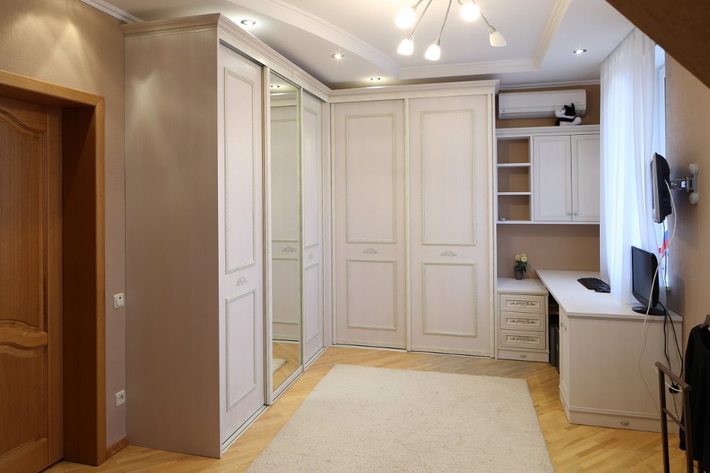 Embebido Se hacen a pedido después de mediciones cuidadosas de esa parte de la habitación donde se instalarán los muebles. Los gabinetes no tienen piso, techo o paredes. Al instalar el marco, en el que se ubican las puertas, se montan "firmemente" en la pared. La principal ventaja de este diseño es el uso eficiente del espacio. Entre las deficiencias, la imposibilidad de transportar a otro apartamento o mudarse cuando se muda.