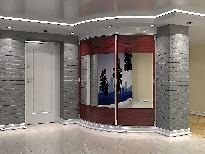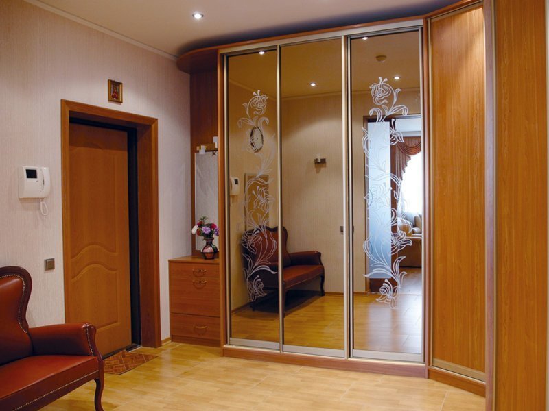 Por lo general, en el pasillo hay pufs o bancos adicionales para zapatos. Los materiales de decoración deben superponerse. Tradicionalmente, las fachadas de los gabinetes están hechas de espejos para que los invitados y los propietarios puedan evaluar su apariencia antes de salir. El relleno está dominado por una sección con una barra para las cosas en los hombros y estantes de "zapatos". Este último generalmente puede eliminar la necesidad de instalar un pie en el pasillo.