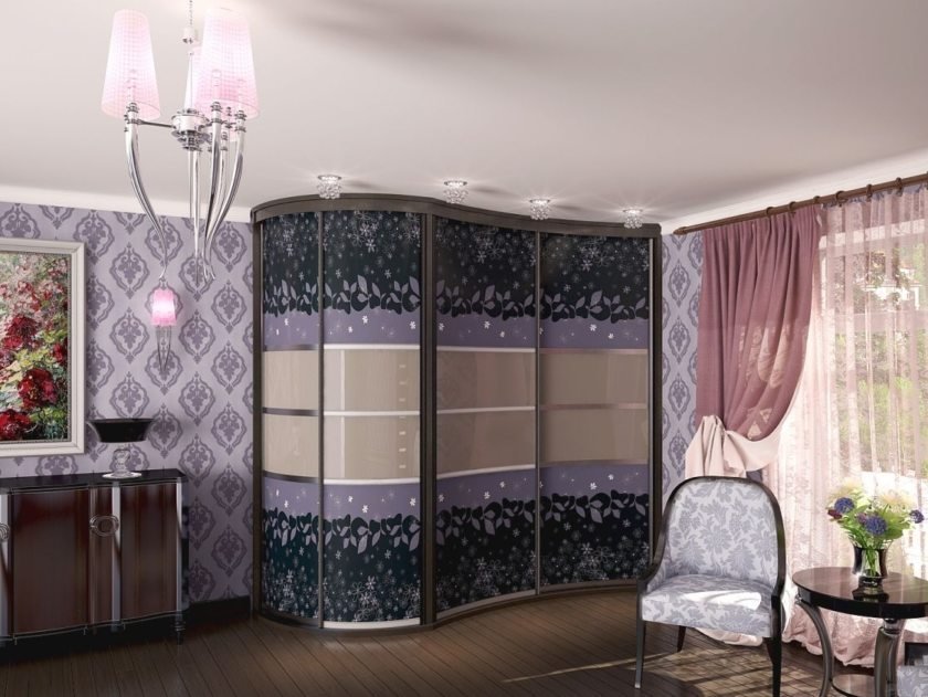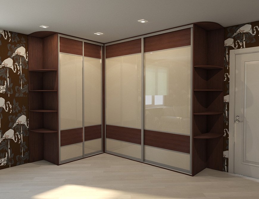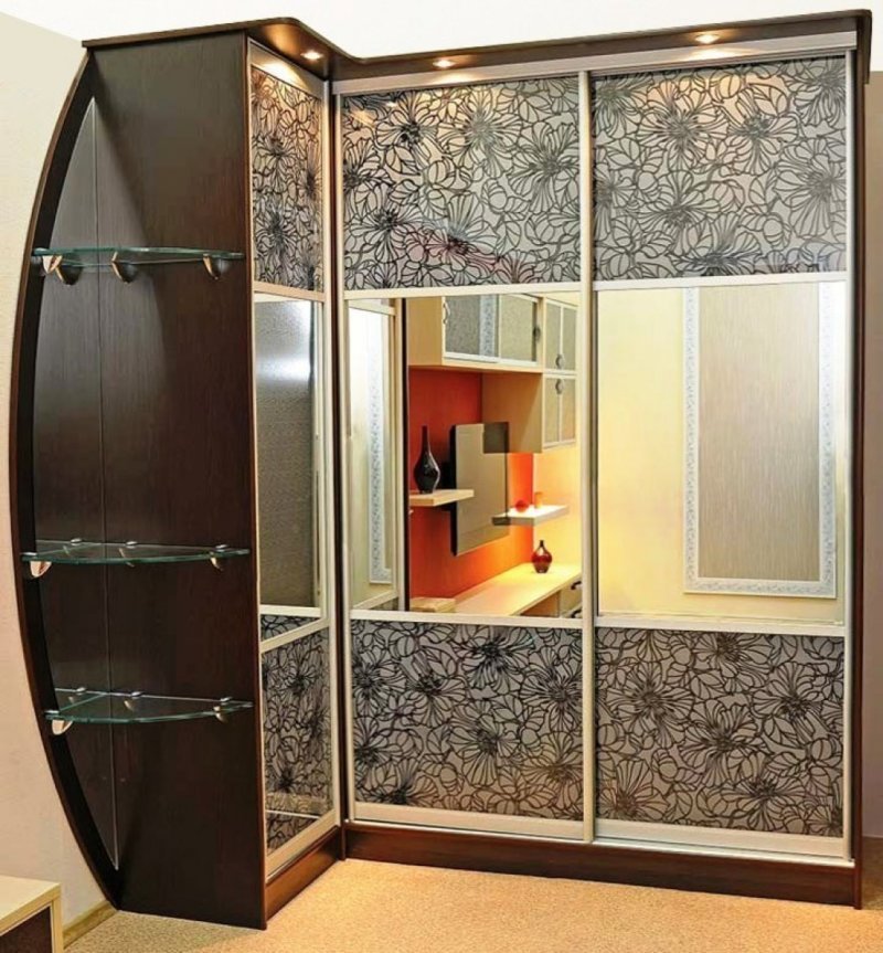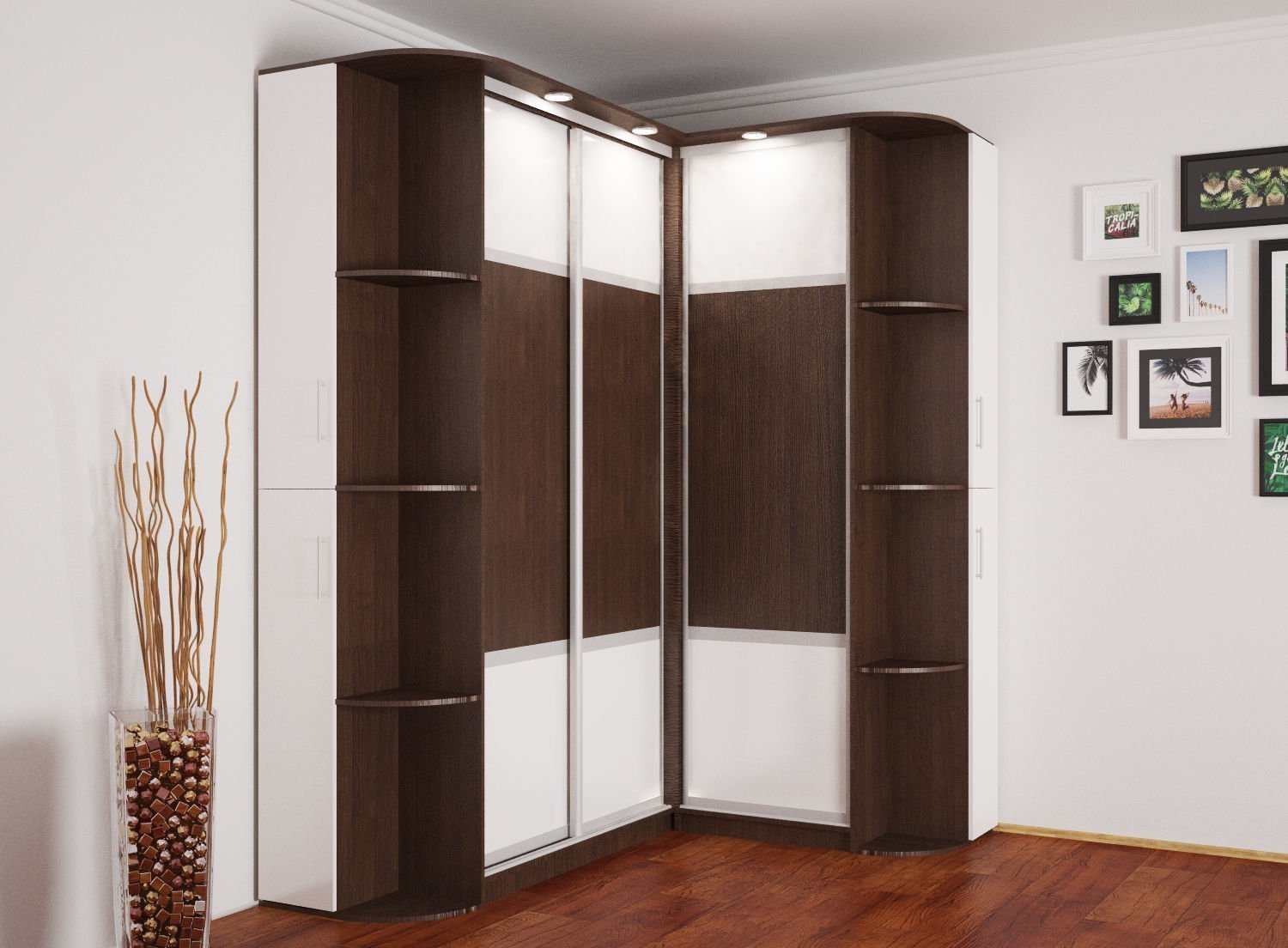 Radio (radial). Los gabinetes de esquina tienen fachadas cóncavas o convexas que se asemejan a las olas. Uno de los modelos modernos más populares. El interior se ve elegante y espectacular.