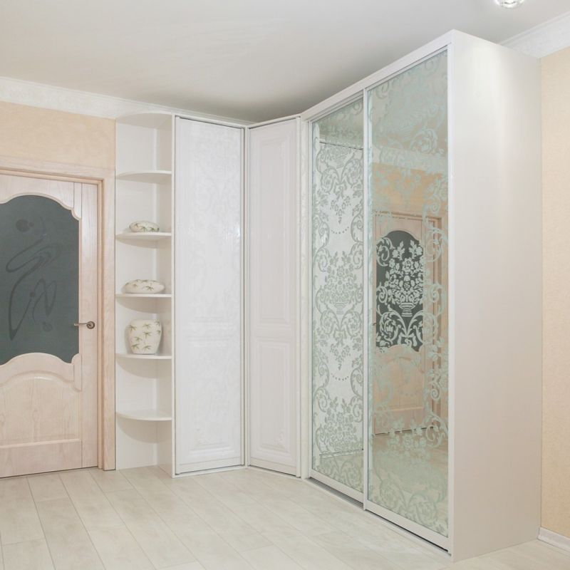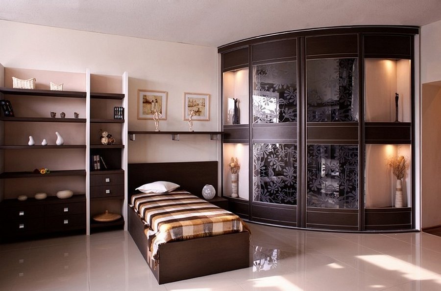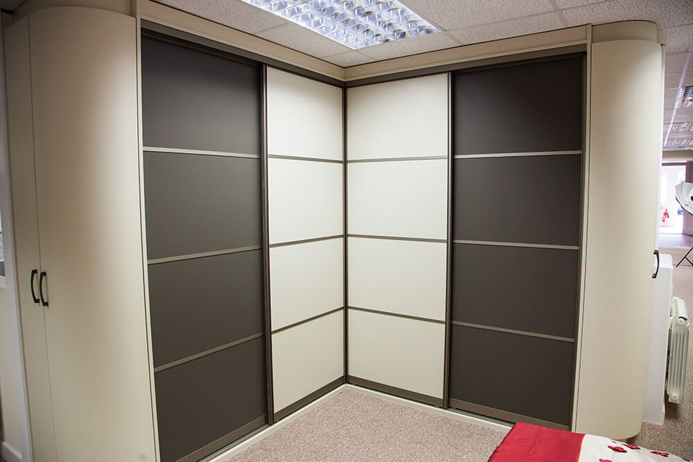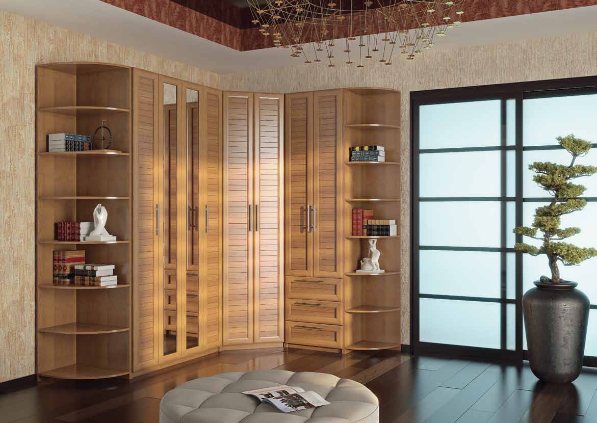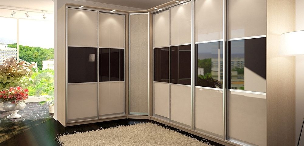 Radio (radial). Los gabinetes de esquina tienen fachadas cóncavas o convexas que se asemejan a las olas. Uno de los modelos modernos más populares. El interior se ve elegante y espectacular.