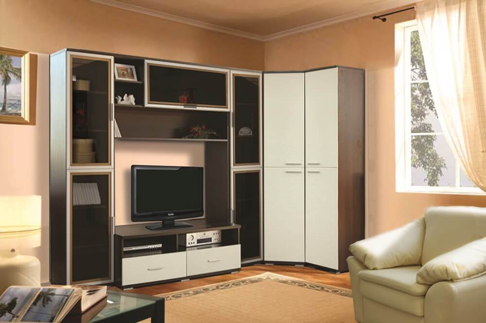 Los armarios rara vez se colocan en la sala de estar. Ahora están tratando de trasladar este mueble a la habitación, porque la moda de los auriculares atascados en la parte superior con libros y cristal ha pasado hace mucho tiempo. En casos excepcionales, los gabinetes de esquina todavía están instalados en esta sala. Se eligen principalmente modelos trapezoidales, radiales y en forma de L. Este último puede complementarse con un nicho para el televisor, que matará dos pájaros de un tiro. Los estantes abiertos al costado se usan como estantería. Un armario de esquina generalmente se adquiere en tono con un sofá u otro objeto de diseño grande en el interior (mesa, sillas) para que no se destaque en la imagen estilística general y no se vea "solo".