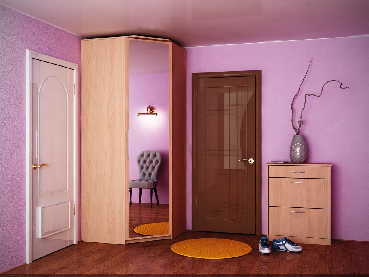 En el pasillo, un armario es una necesidad para no abarrotar otros lugares para guardar cosas con ropa exterior; está colgado dentro de una estructura tipo esquina. Para habitaciones pequeñas y estrechas, las opciones triangulares son adecuadas. Si el corredor se apoya contra una pared en blanco, este mueble se coloca debajo de él. Como opción experimental, el gabinete se puede colocar cerca de la puerta principal, si hay suficiente espacio desde este hasta la esquina más cercana. El diseño no solo debe coincidir con la paleta de colores general, sino también en armonía con el resto de los muebles.