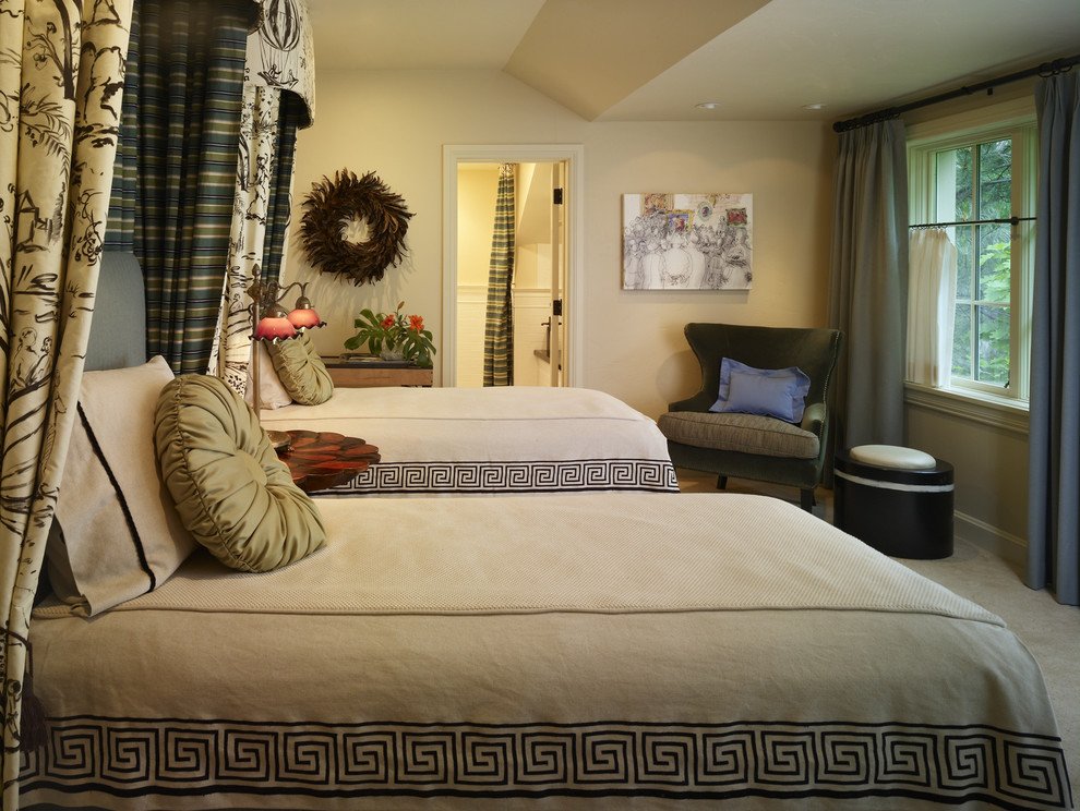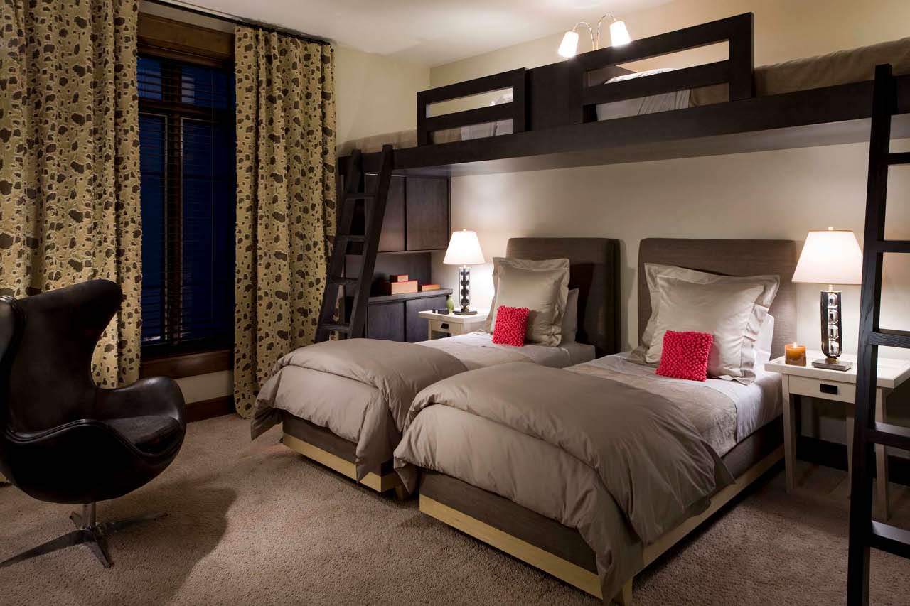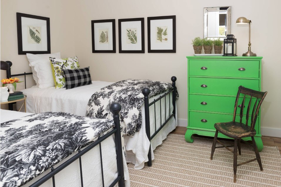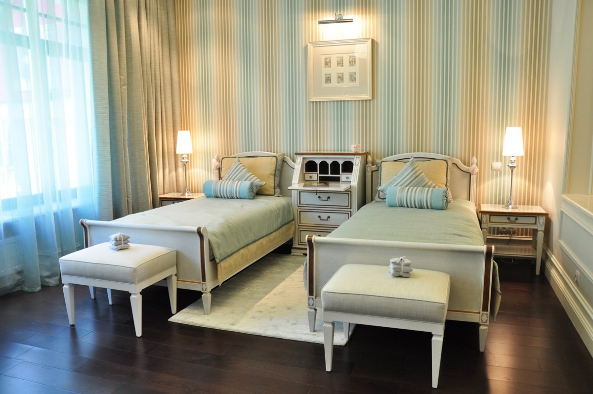 Primero debe proporcionar un lugar para las pertenencias personales de quienes duermen en esta habitación. No deje menos de 60 cm para el pasaje. Una de las principales formas de instalar dos camas en el dormitorio se basa en la simetría. Se necesitarán dos sillas y un par de mesas de noche, con la expectativa de que habrá dos personas en el dormitorio. Otro método es la disposición angular de las camas. En este caso, el principio "cabeza a cabeza" es más adecuado, con menos frecuencia: "pie a pie". Una disposición angular con un ángulo libre le permite almacenar una gran cantidad de objetos en el espacio resultante. Allí puede instalar muebles altos con estantes cerrados. La cuarta forma: colocar los muebles del dormitorio en una línea a lo largo de algunas de las paredes. Las camas están niveladas, cabeza a cabeza, y habrá suficiente espacio a un lado para un amplio pasillo. En todas las situaciones anteriores, se recomienda equipar los lugares para dormir con secciones para almacenar cosas de diferentes tamaños y formas.