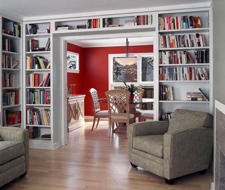Biblioteca fantasma Este truco se utiliza en el diseño de interiores clásicos para el hogar, así como en cafeterías y restaurantes temáticos. Las publicaciones antiguas no son baratas, por lo que los libros falsos, que consisten en una cubierta y un inserto de plástico, ayudan.