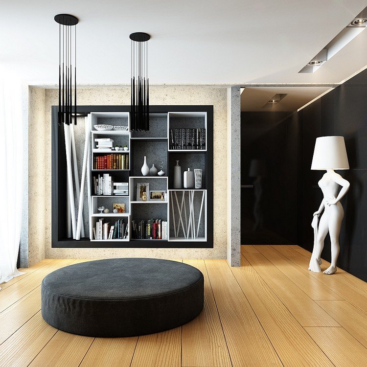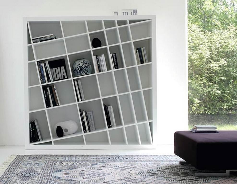 Colocación de volúmenes en ángulo. Una solución tan interesante para una sala de estar o un dormitorio parece tan inusual que apenas se necesitan otros artículos de decoración.