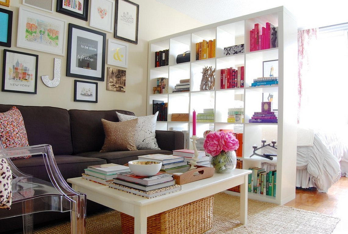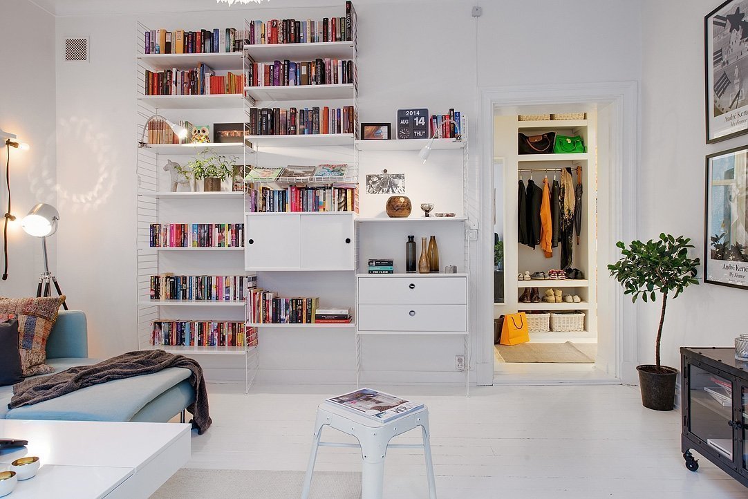 Como ya se mencionó, los estantes son excelentes para dividir la habitación en zonas separadas. Por ejemplo, puede ser una "pared" o una estructura baja que separa el área de descanso del comedor. Además, es posible delimitar el espacio no solo con muebles clásicos, sino también con volúmenes de libros. Una opción interesante es un experimento con sombras. Primero, las encuadernaciones de libros se seleccionan por color y luego se determinan con un fondo. Por supuesto, los colores neutros se ven mejor, especialmente el blanco.