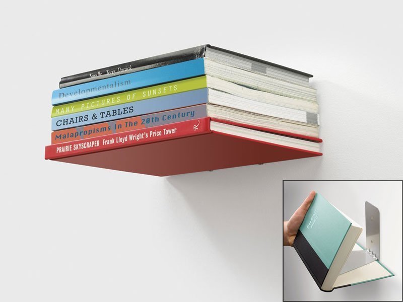 Con monturas ocultas. Los titulares son invisibles.Parece que la estructura está pegada o unida a la pared de una manera impensable. De hecho, los estantes están montados en pasadores metálicos macizos y atornillados.