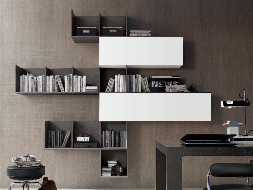 Dependiendo de la ubicación, hay versiones de pared y piso. Estos últimos tienen un tamaño bastante grande. Además del propósito principal, a menudo sirven como particiones en apartamentos tipo estudio.La opción más común es un estante hecho por el tipo de mueble "pared", dividido por alto y ancho en sectores separados. El "caos ordenado" de los diseños modulares cerca de sillones o sofás también se ve original.