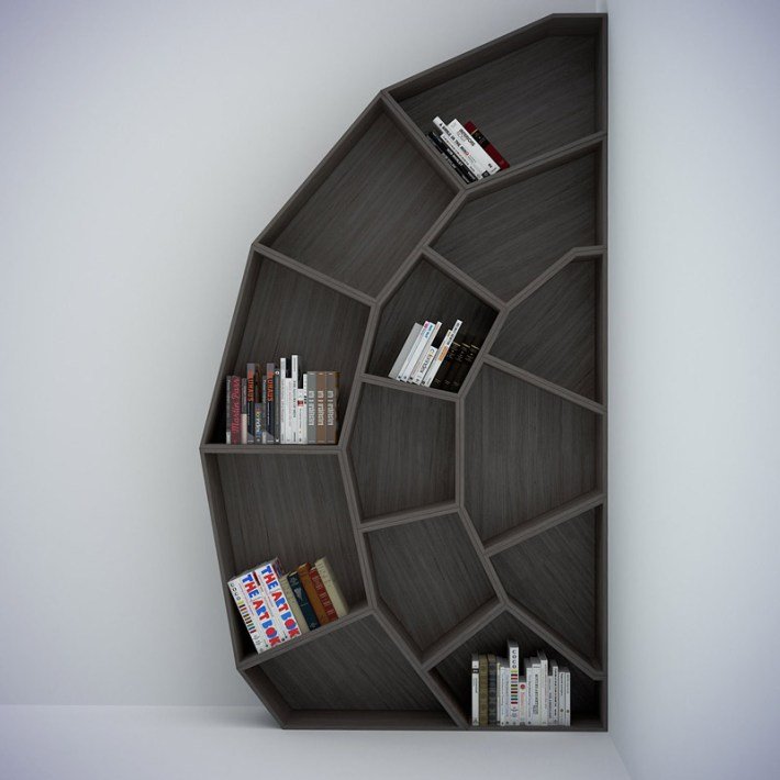 Este es un estante modular. Bloques de la misma configuración, que pueden rotarse de diferentes maneras, cada vez que reciben una versión completamente nueva.Ahora podrá diseñar de forma independiente un mueble único a un costo mínimo. Los estantes están bien combinados en un estante, se ven originales en forma de una estructura de pared que se asemeja a un panal de abeja de forma irregular. Puede usar este diseño inusual en forma de una partición liviana para zonificar el espacio de la habitación.