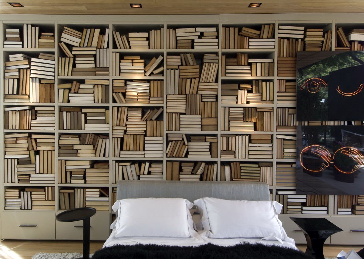 Libro "muro". Esta opción es para propietarios de una extensa biblioteca doméstica. Los estantes del piso al techo actúan como un centro compositivo original. No es casualidad que muchos diseñadores utilicen dicha solución.Puede ordenar la literatura según varios criterios: tamaño, textura o color de la cubierta.