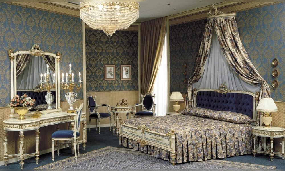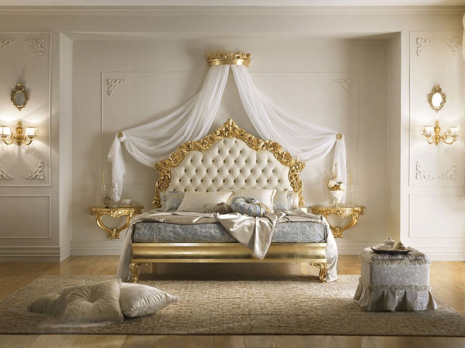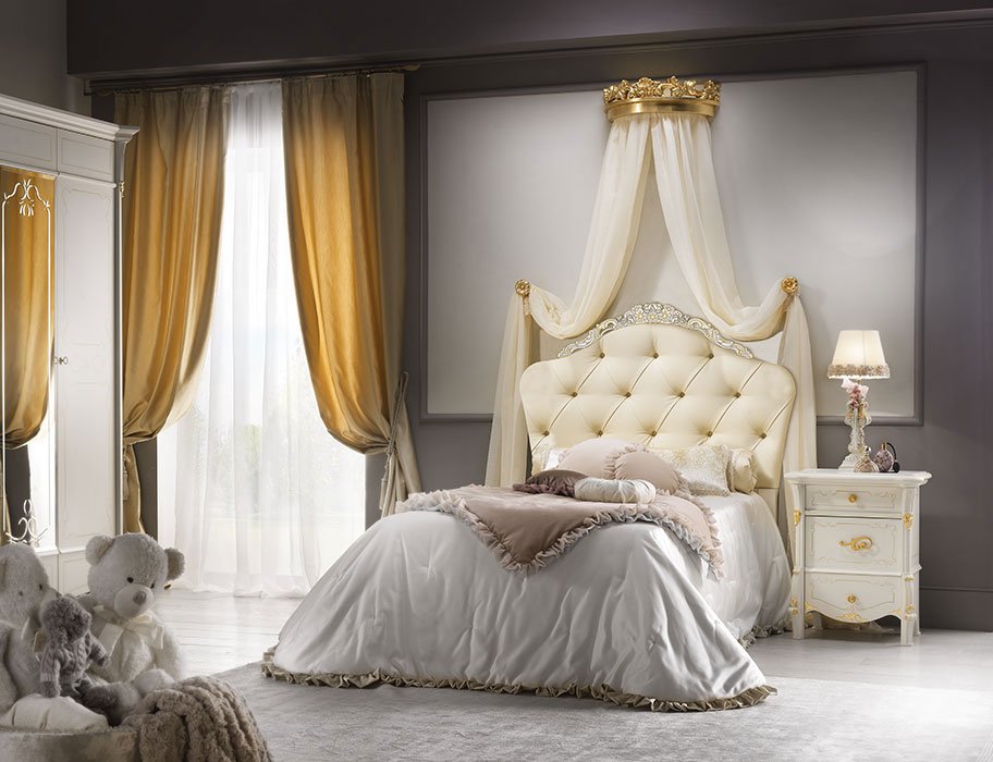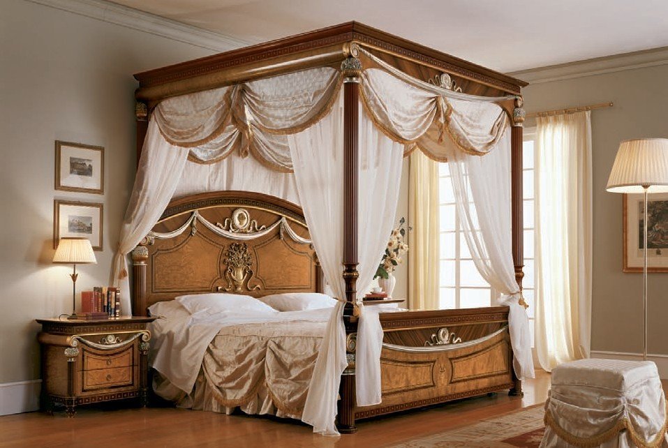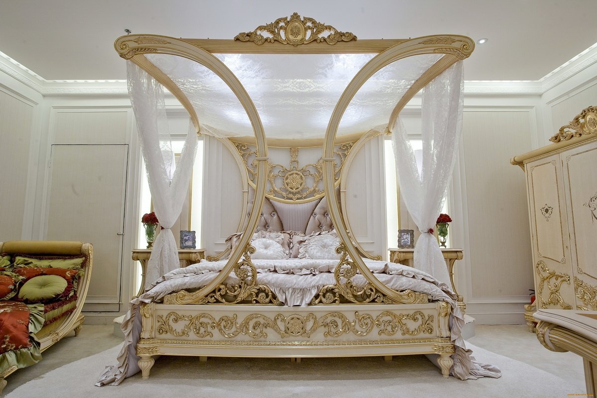 Este Una cama en este estilo debe ser fabulosa, por lo que la capota se elige lo más expresiva y lujosa posible.